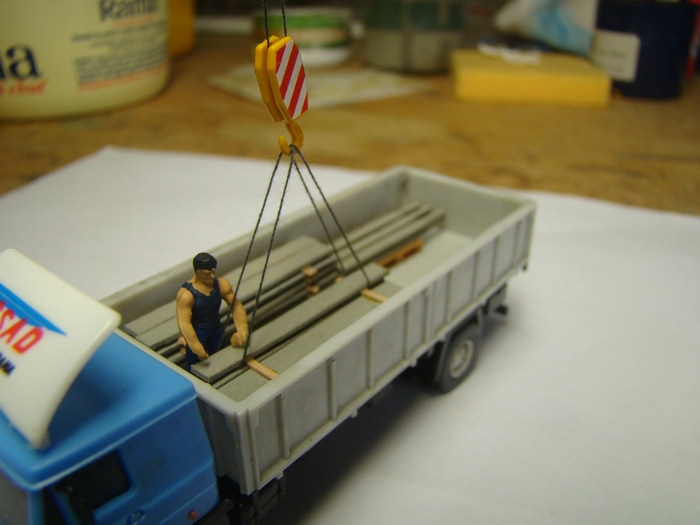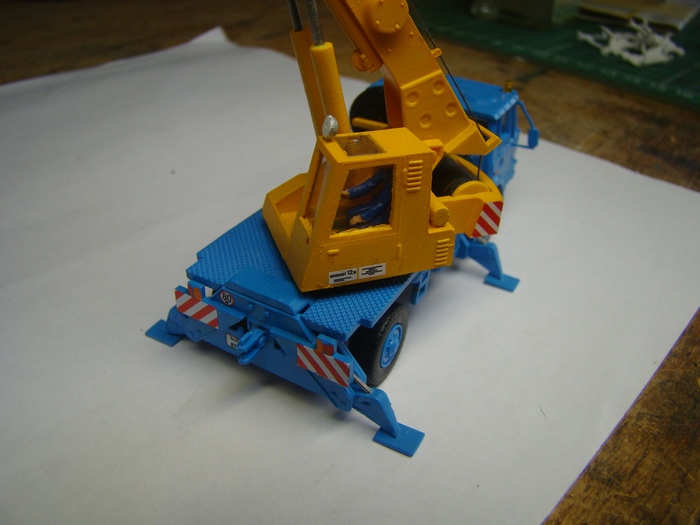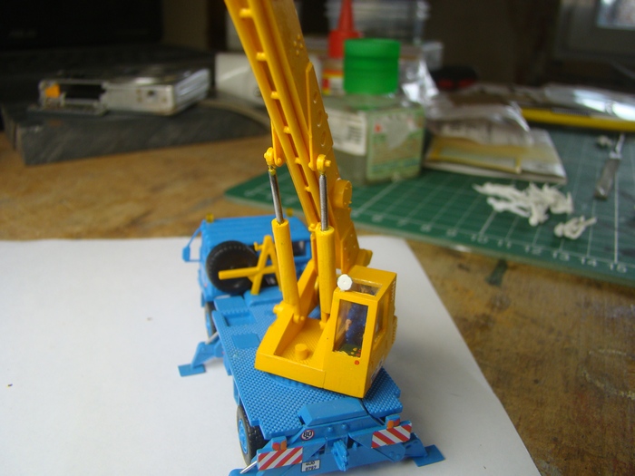 Upravil jsem zadek kabiny jerabnika, kde puvodne okno bylo az dole coz dle fotek neodpovida. Doplnil jsem kovove pisty pistnic patek jerabu z dratu. Abych mohl jerab zapojit do "akce" tak jsem namotal na buben lano z niti.