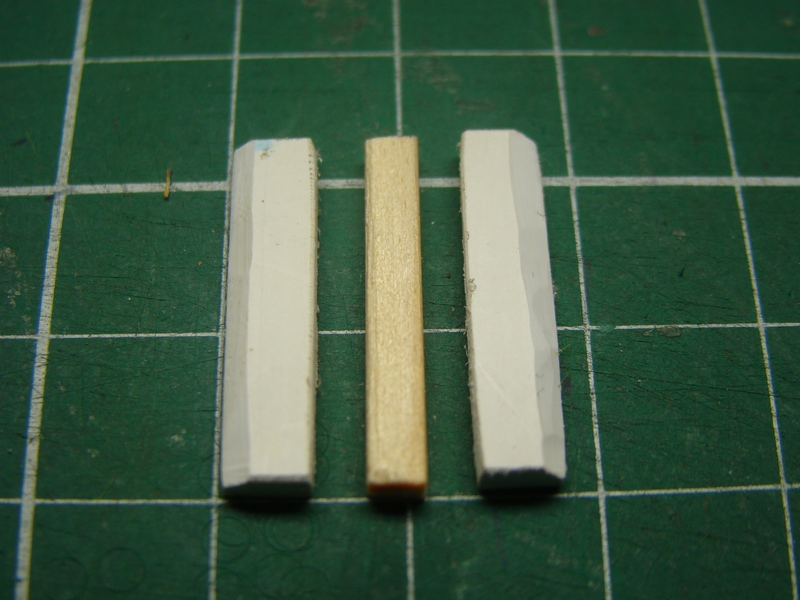 Já jsem si pro výrobu zvolil tu první variantu. Na výrobu jsem použil zbytky plastových kousků z elektrikářských lišt, které jsem nařezal na rozměry 22*5 mm. Nožíkem jsem srazil hrany tak aby mě nevadili těm úchytkám co drží koleje. Dále jsem upravil smirkem hranolek 3*3 mm na rozměry 3*2 mm a nařezal na délky 22 a 13 mm.