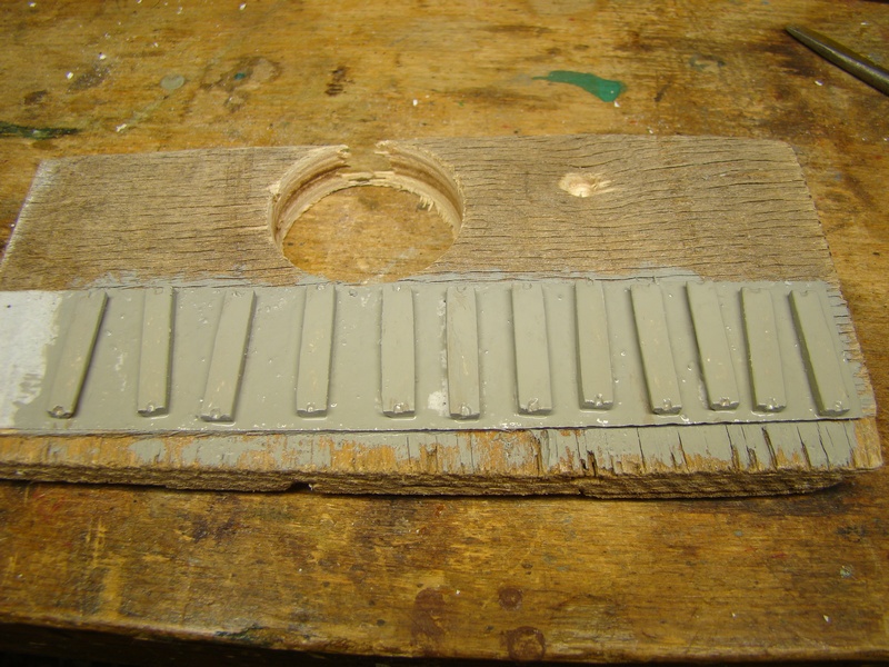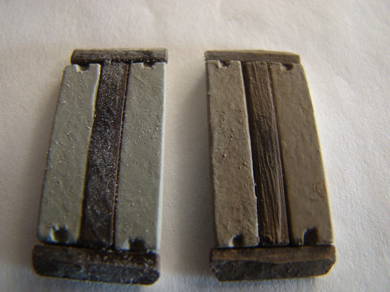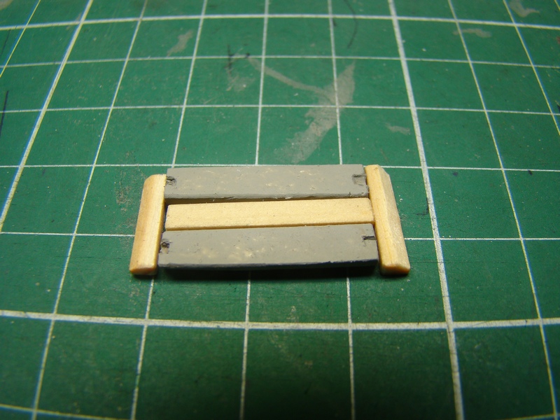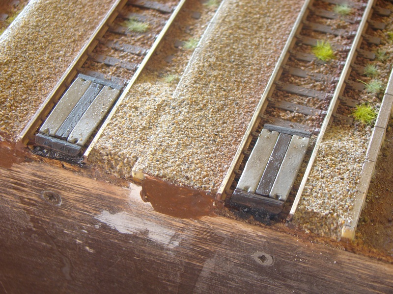 Dřevěné hranolky jsem natřel hnědou akrylovou barvou. Po zaschnutí jsem vše slepil sekundovým lepidlem a ještě ze spodní strany zafixoval zatlačením dvousložkového lepidla do mezer mezi plasty a hranolky. Ze spodní strany jsem vše musel pak sesmirkovat do roviny. Zároveň jsem srazil ještě hrany na těch krátkých dranolkách aby opět nezavazeli úchytům kolejí.