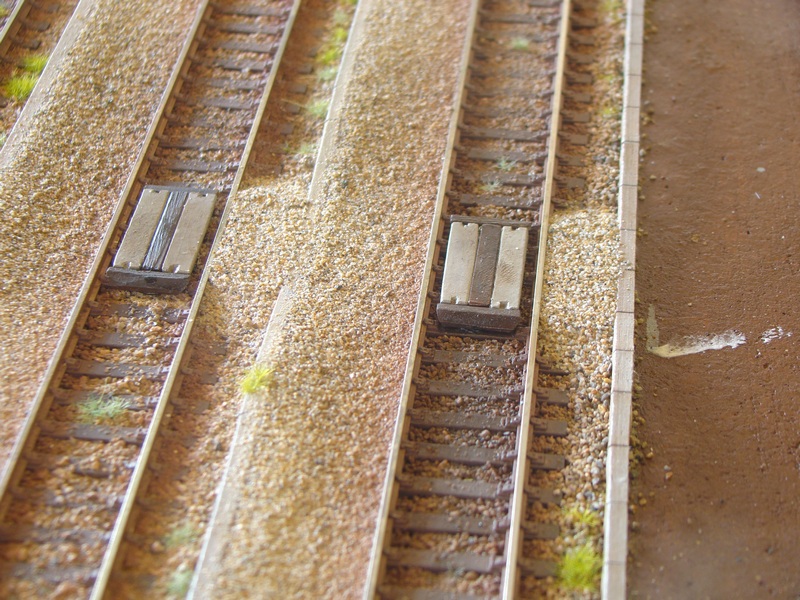 Takhle vypadají přechody zalepené mezi koleje. Lepil jsem dvousložkovým lepidlem tak snad to bude držet i na hranách. Dosypal jsem štěrk k přechodům zvlhčil vodou s jarem a zalel ředěným duvilaxem.