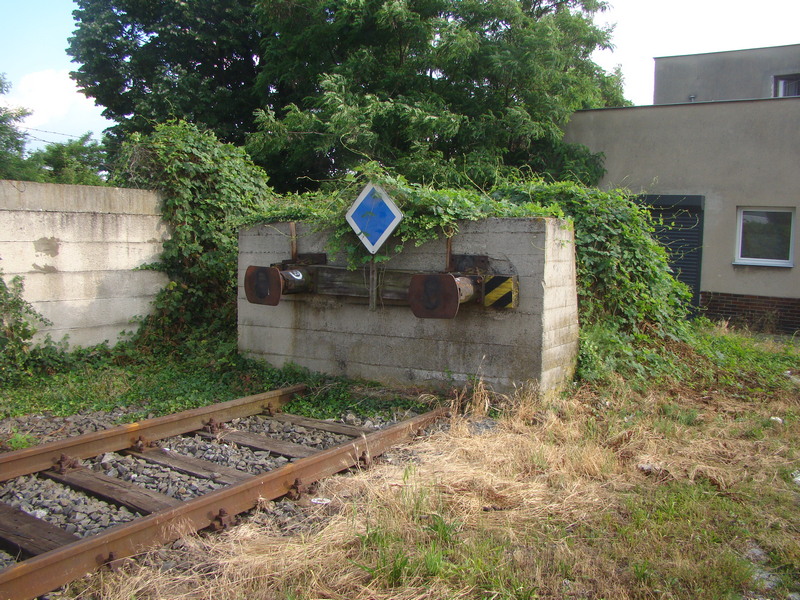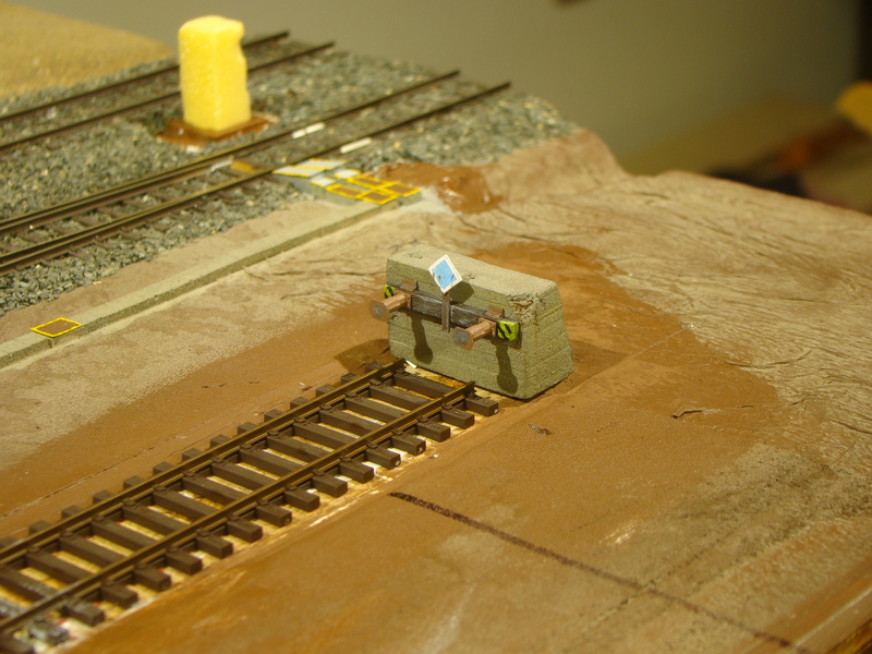 Tady jsem se snažil naznačit mastnotu na styčných plochách nárazníků a nějakou patinu. Na styroduru akryl, na nárazníkách a pražci syntetika.