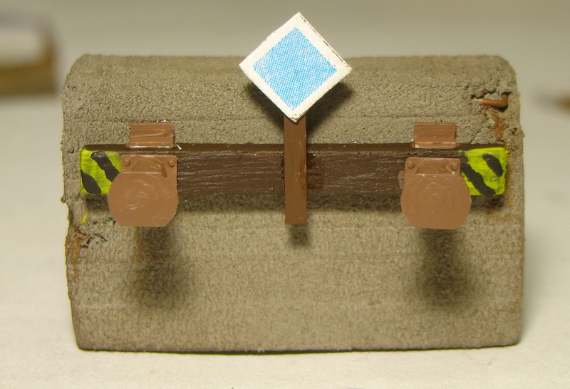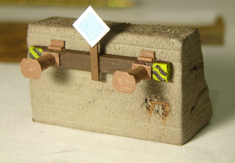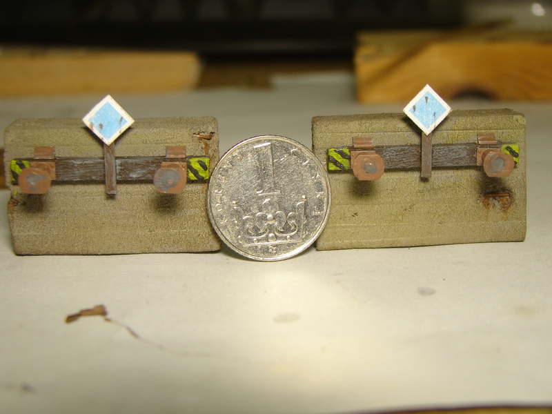 Tady je složený pražec který je vyrobený z smrkového hranolku 3x3mm sesmirkovaného na 3x2mm. Do něj jsem navrtal díry a usadil nárazníky. Z evergreenu profilu L 1,5x1,5 jsou udělané ocelové úhelníky přes které je pražec v reálu přišroubovaný k betonu. Jak nárazníky tak i úhelníky jsem natřel syntetikou revell kterou mám namíchanou na odstín REZ.