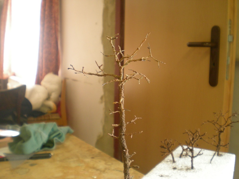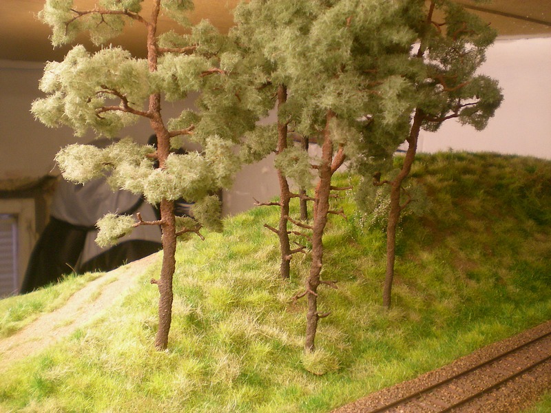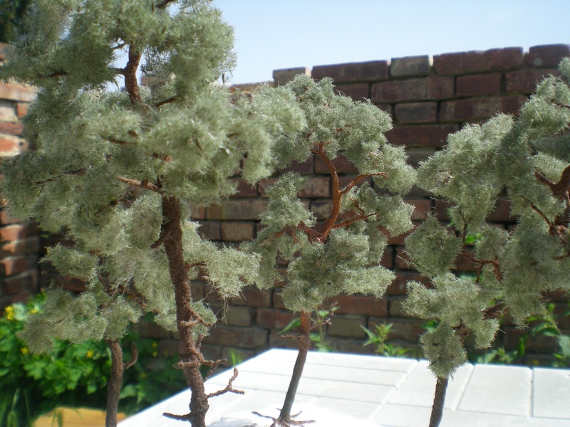Pak jsem na konce větviček lepil duvilaxem STATDEKOR jemný, zeleň borovicová od Poláka. Nastříhal jsem jej nůžkama na kostičky asi 1*1 cm a pinzetou natrhal aby to nebyli čtverečky.