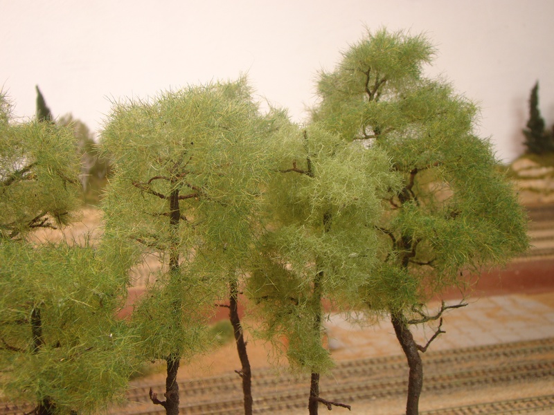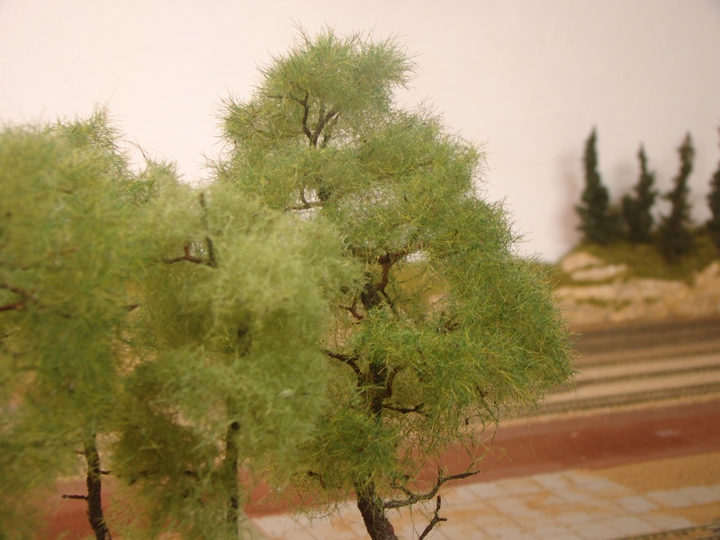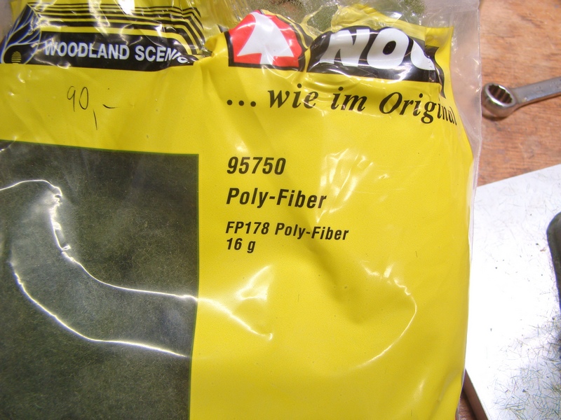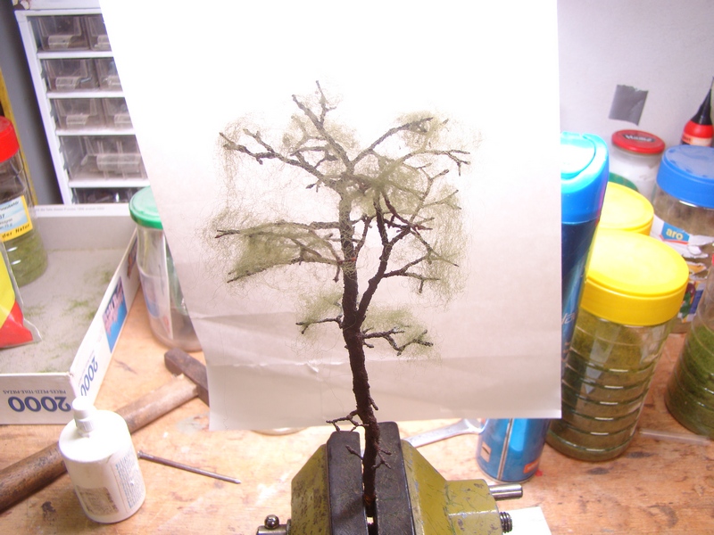 Prvně jsem na koruny nalepil duvilaxem na konce větviček chomáčky polyfiberu. Opravdu velmi jemné chomáčky.