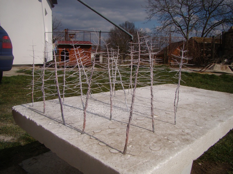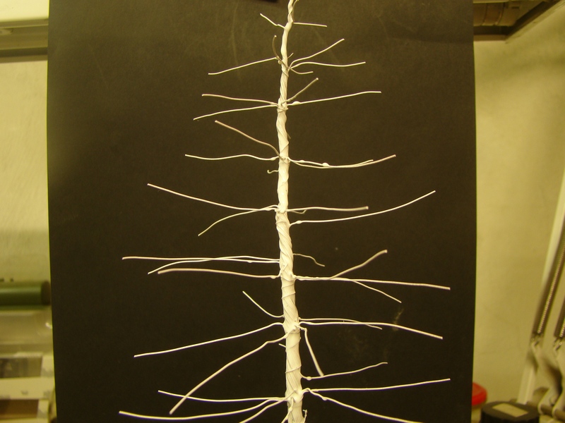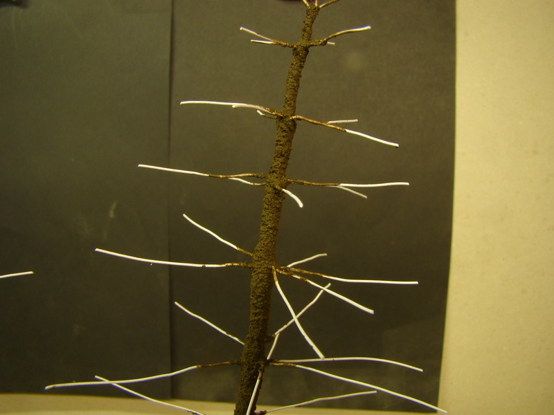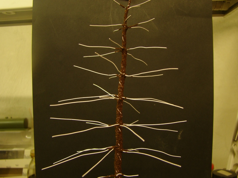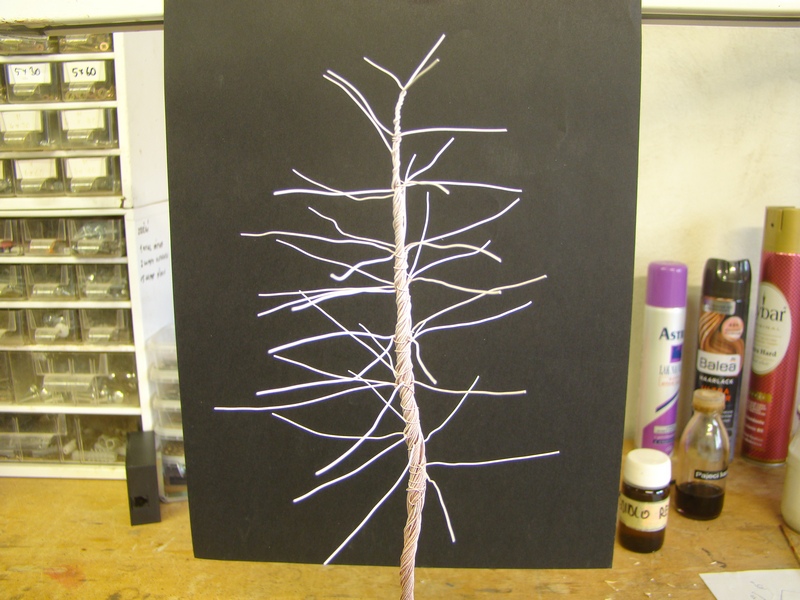 Dalším postupem je nastříkání kostry základní barvou na kov ve spreji ať pak barva lépe chytne. Možná by chytla i tak ale přeci jen. Jen jsem nezvolil dobrou barvu základní barvy. Lépe by bylo sehnat hnědou ale tu jsem v obchodě nesehnal. Na další stromky jsem koupil červenohnědou. Ta by měla jít lépe přestříkat než ta bílá.