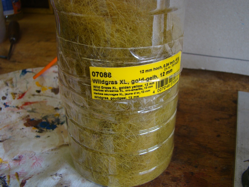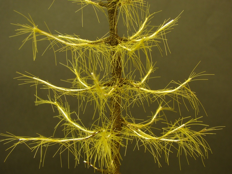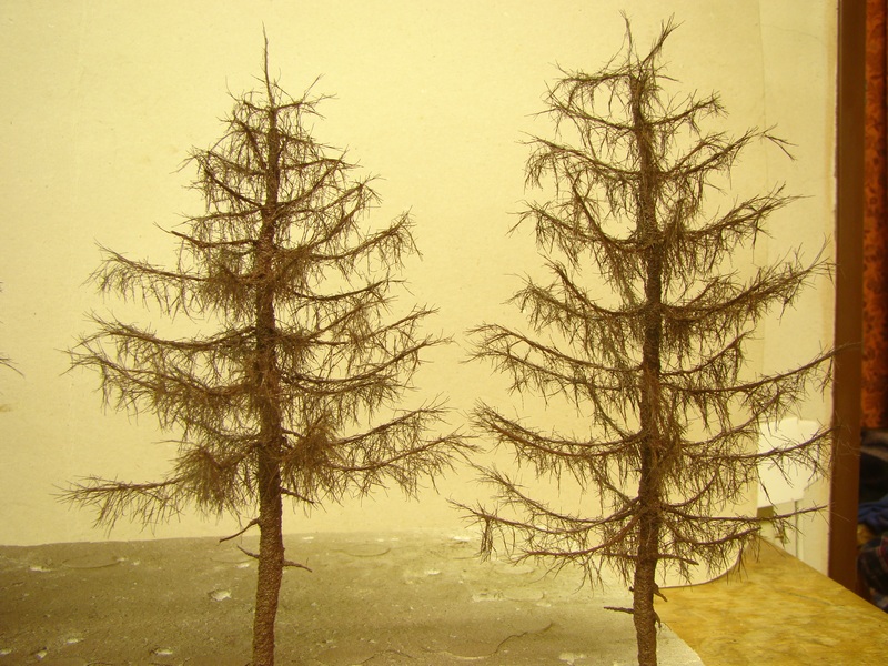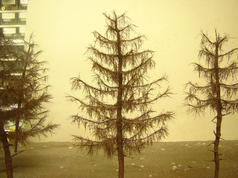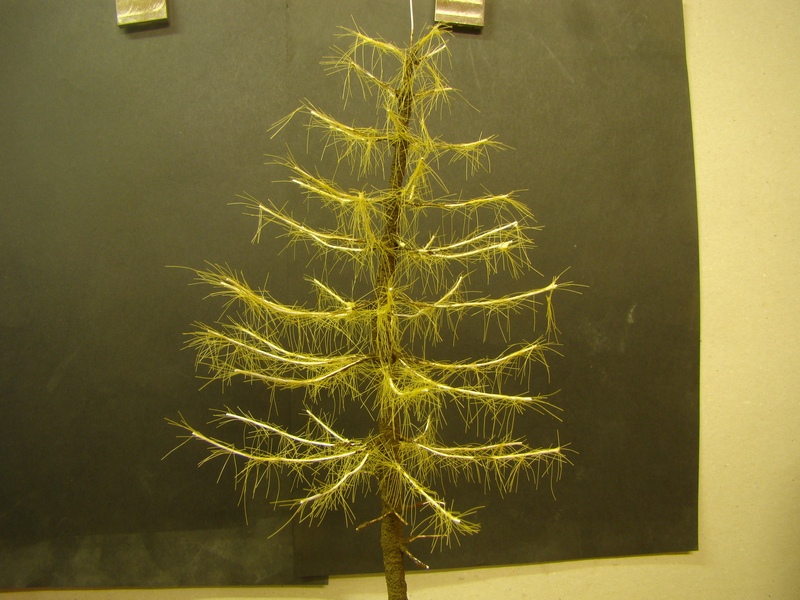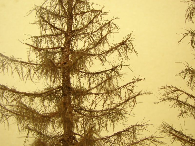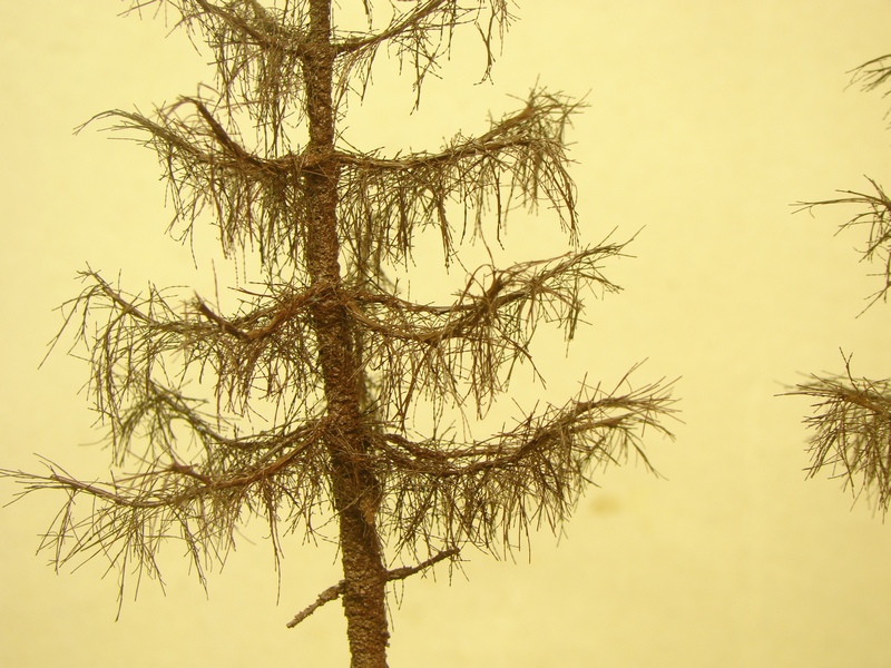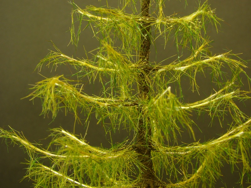 Dalším postupem je natření větví stromu opět hustým duvilaxem štětcem pokud možno ze spodu. Ono to moc dobře nejde neboť duvilax se dostane i nahoru ale snaha je to natírat zespoda. Zkoušel jsem i jinou délku trávy co jsem měl doma 6 mm ale nejlepší výsledek mám s tímto. Jen se ta tráva asi vzhledem k délce špatně flokuje. Naflokovat pokud možno dost nahusto.