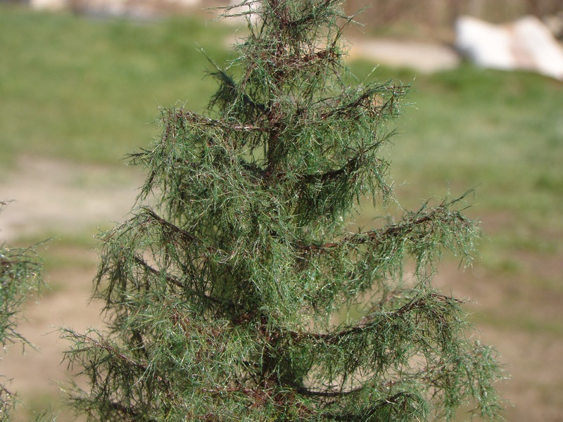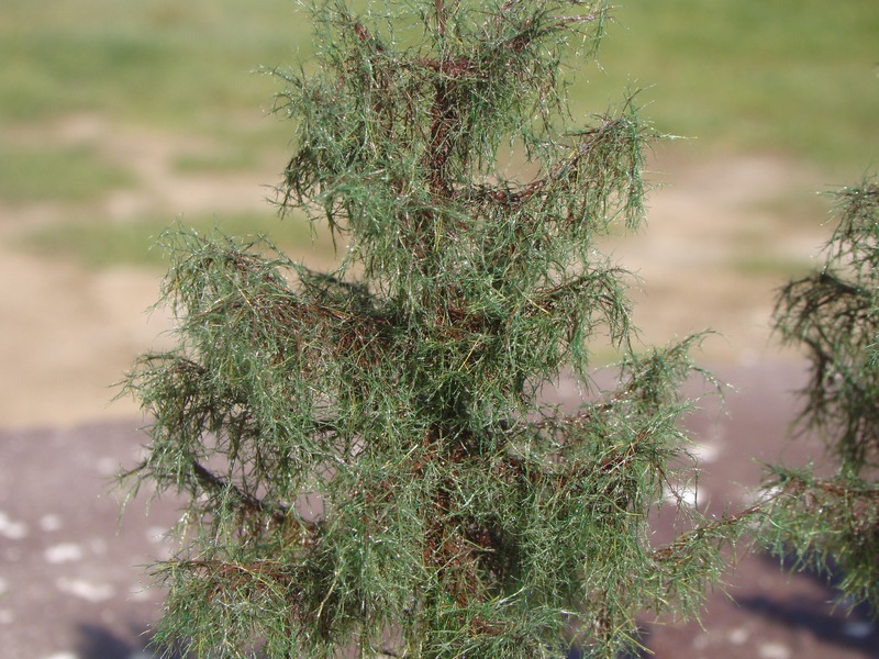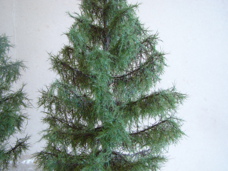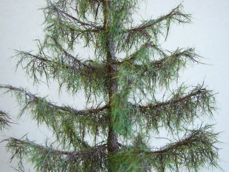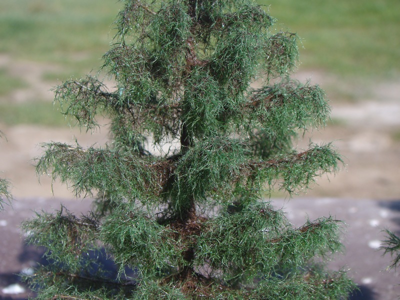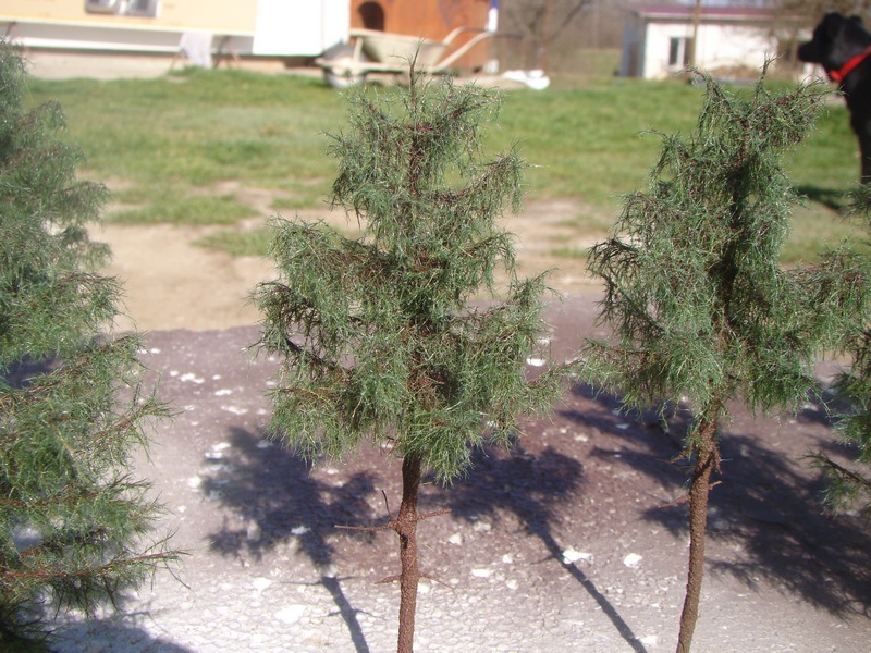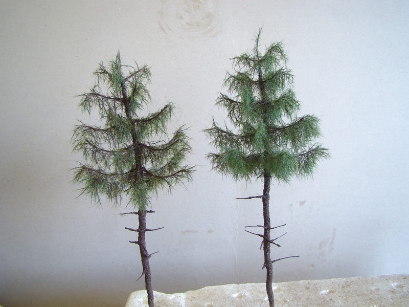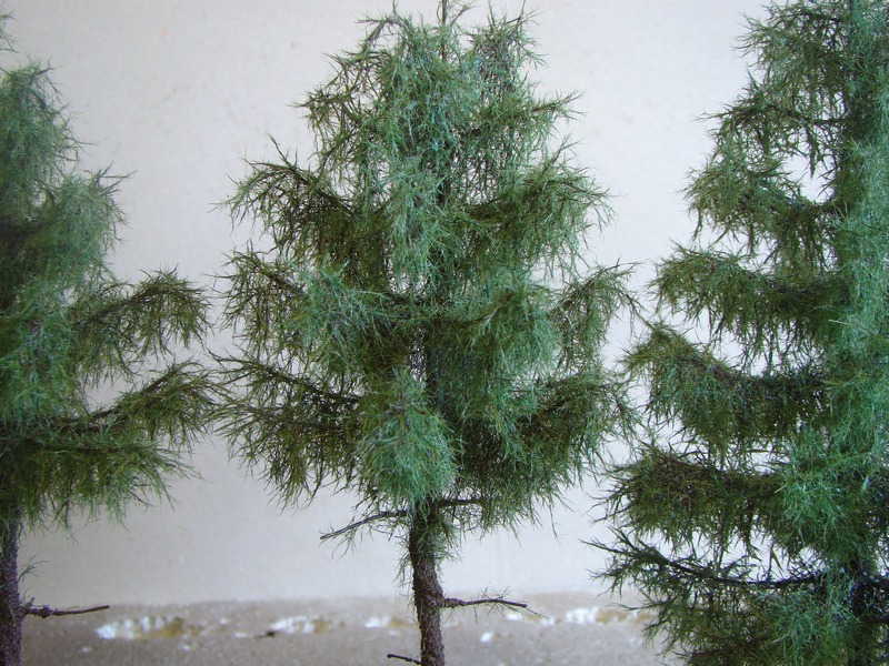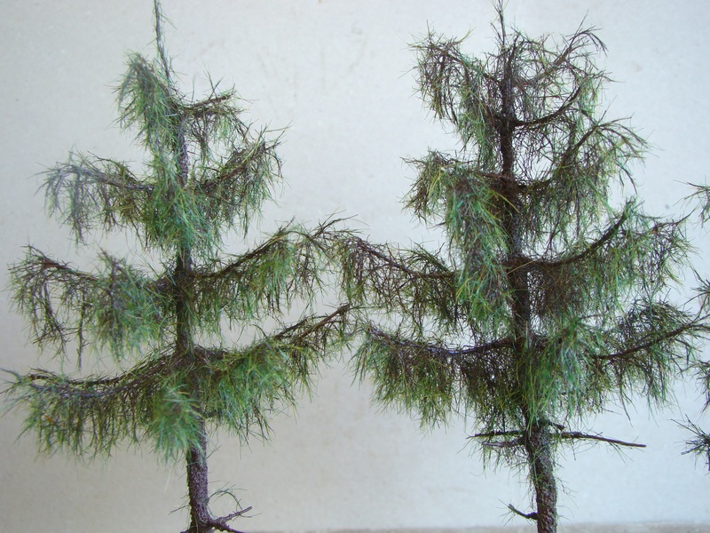 Netřeba flokovat úplně nahusto ať není ze větví chomáč zeleného. Flokuji opět pokud možno se spodu a jen vršek ze stran. Opět se snažím flokování sfouknout dolů fénem. Tak nějak vypadají po naflokování oba druhy stromků. Jak "středolesový" tak i "krajolesový".