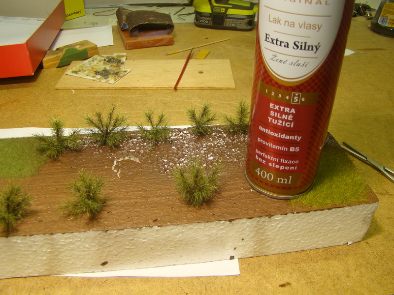 Po zaschnutí lepidla jsem keře nastrkal do polystyrenu a celé přestříkal barvou ve spreji DUPLICOLOR Aerosol art odstín 8017 matný.