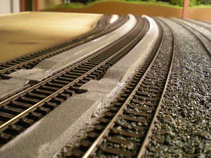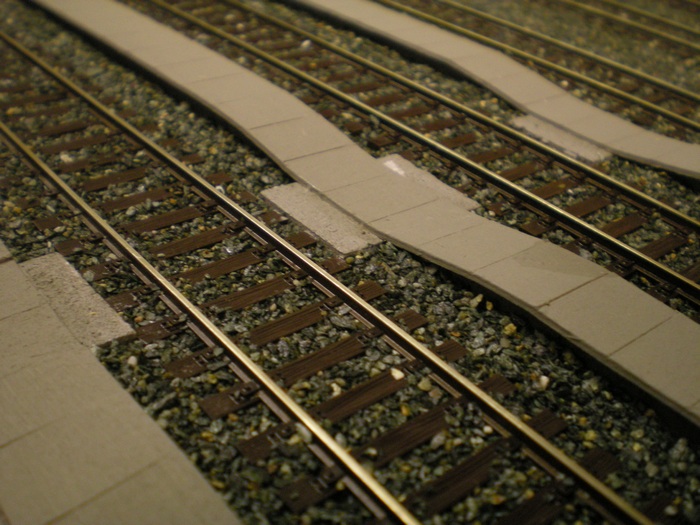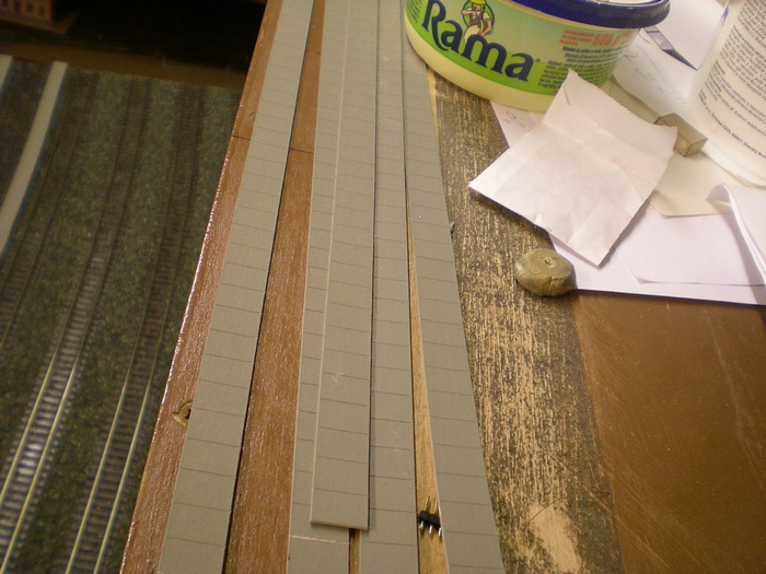 Zakladem nastupist je styrodur narezany na pasky o tloustce 5mm a sirce 10mm, ktery jsem nalepil na desku duvilaxem a vystredil mezi koleje. Jen pripominam ze je to pro velikost H0.