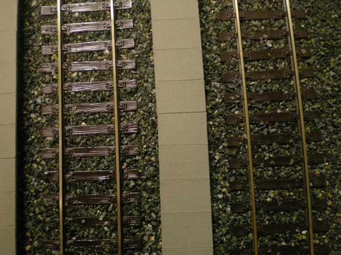 V miste prechodu pres koleje jsem material serizl a vlepil mezi serezane dily nastupiste desku opet ze styroduru o tl 2mm. Pak jsem vse natrel fasadni barvou kterou jsem si nechal namichat dle vzorniku na odstin cca betonu. Kazdy beton je jiny, takze jsem to vzal odhadem. Odstinu je spousta a 1kg barvy vyjde cca na 100kc.