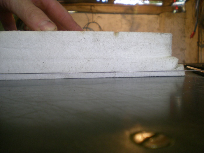 Silu rezu jsem po nekolika pokusech urcil tim nejjednoduzsim a v podstate i nejrychlejsim zpusobem. Proste podlozim drat na obou koncich mista pro rezani. Nejlip co nejbliz u styroduru protoze cim delsi je drat, tim vic se prohyba a vlni.