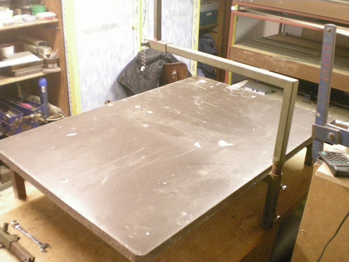 No a k vlastni rezacce. Ja mam udelanou v celku slozitou konstrukci, ne ze bych to planoval pri stavbe, ale reze se sni i zatepleni baraku. Mel to puceny i kolega z prace a zednici pry cuceli jak se to da jednoduse a hlavne presne rezat. Rezacka je svarenec z jekliku, je rozebiratelna tak aby se dala prevest. Tady jsem ji vyfotil na stole v dilne, je jen polozena na stole, nema dane nohy v rohach. Jinak umi stat i sama. Rezacka umi rezat jak svisle tak vodorovne podle toho jak se nastavi. Tady je zrovna na svisli rez.