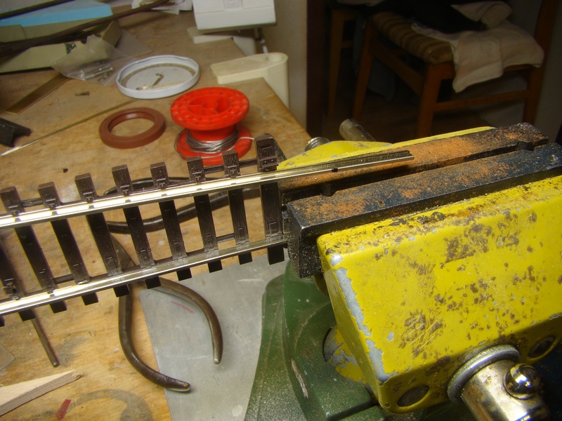 Dale je potreba vytahnout postupne obe krajni koleje a spilovat jejich patu v miste kde bude novy jazyk dolehat ke kolejnici.