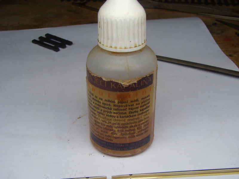 Jedno z mala mist kde pouzivam ostrejsi pajeci kapalinu. Nedoporucuji sni letovat bezne spoje nebot ty pak oxduji a to nepotrebujeme. Tohle je NEUTRALNI PAJECI KAPALINA. Musi se pouzit kvuli tomu, ze kancelarske sponky jsou kovove a kalafuna by si snimi neporadila. Kdo pouzije neco jineho naz kancelarske sponky, tak muze pouzit i kalafunu kdyz mu to material umozni.