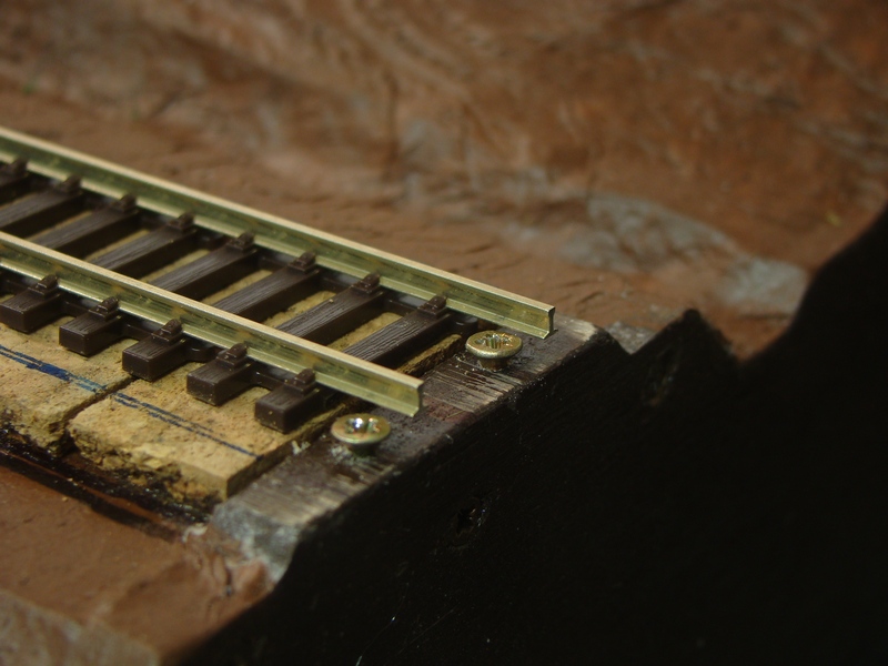 Po narýsování jsem položil do místa kolej a v místě kde vycházejí kolejové pruty jsem si označil místa pro našroubování vrutů. Je vhodnější koupit asi mosazné ale jde to i běžnýma ocelovýma vrutama do dřeva. Než vrut zašroubuju tak si místa předvrtám. Já používám vruty prům. 2,5 o délce 20-25 mm záleží jaké zrovna mám. Takže předvrtávám vrtákem prům. 1,8 (prům. vrtáku odpovídá prům. středu šroubu) Vruty zašroubovávám tak aby když posunuju kolejí nad vruty, tak aby o vruty nebrnkali pruty kolejí a raděj ať je tam desetina mezera než aby vrut pak kolej zvedal.