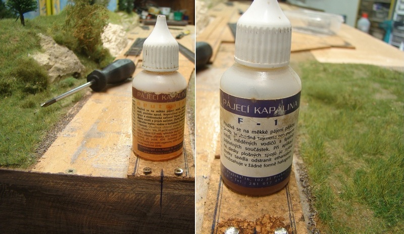 Kolej při letování nechám kousek přečuhovat přes modul abych ji pak mohl zaříznout a zasmirkovat tak aby netrčela přes hranu a nemohlo dojit k jejímu utržení. Je to v celku zásadní věc alespoň u modulovky neboť když by kolej trčela, tak by při srovnávání dvou modulů mohlo dojít k zachycení trčící koleje sousedním modulem a mohla by se kolej urvat což nikdo nechce. Kolej by tuším i podle nějakého pravidla měla být schována (podbroušena) o nějakou hodnotu. Na kolej i šroub v místě letování nakapu kapalinu F-1 a opět obouručně s přidáváním cínu kolej naletuju na vruty.