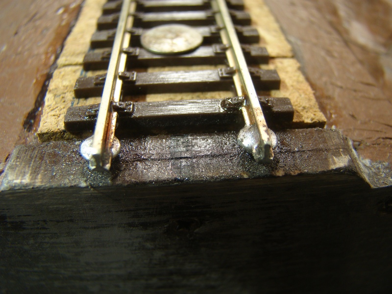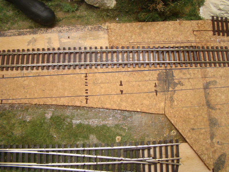 V místě kde bude kolej naletovaná na šrouby nebo kde se budou letovat vodiče je dobré očistit patu koleje pilníkem nebo smirkem neboť ne vždy jde na kolej snadno letovat. Třebas u tilligových brunýrovaných prutů je to téměř nutnost. Tam by spoj při použití jen kalafunové kapaliny F- 1 nemusel držet. Pomocí pájecí kapaliny F -1 pocínuju tedy místa kde budu letovat koleje na šrouby a kolej srovnám podle čar a zafixuju připínáčky. To je výhoda použitého korku neboť ve styroduru připínáček nedrží a třebas do překližky je problém jej zatlačit. Položená a srovnaná kolej s naletovanýma drátama (přibližně v polovině je vidět místo kde jsou dráty ke koleji přiletované). Letování drátú ukážu dál v článku.