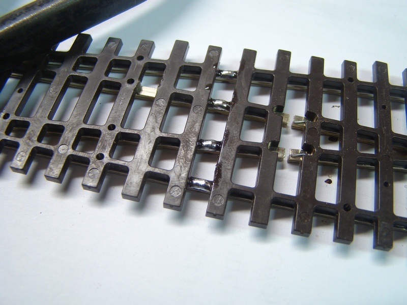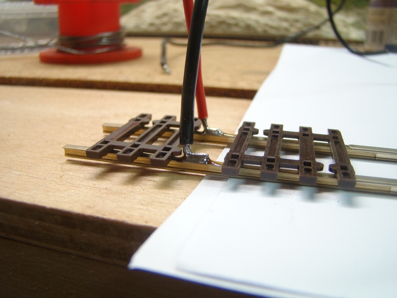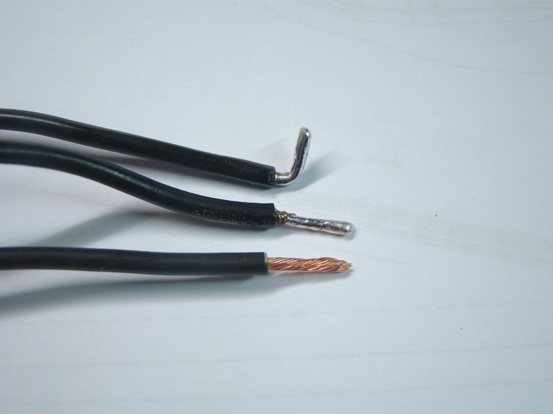 Jako vodiče používám měděné licny o průřezu 1 až 1,5 mm záleží co koupím. Opět nedoporučuju používat dráty tvrdé ale ty spletené ohebné. Tvrdý drát může časem upadnout. Nedoporučuju požívat ani úplně tenké vodiče neboť přeci jen proud do lokomotivy může být dost velký a když by došlo třebas ke zkratu tak je ještě větší a tenké vodiče by proud nemuseli přenést a roztekli by se. Dráty prvně oholím cca 1 cm, pokapu kapalinou opět F -1 a pocínuju. Pak ohnu do pravého úhlu a ohyb pak zacvaknu na potřebnou délku tak aby mě vlezl do mezery mezi pražce kde jej budu letovat. U výhybky mám méně místa, tam dělám ohyb kratší.