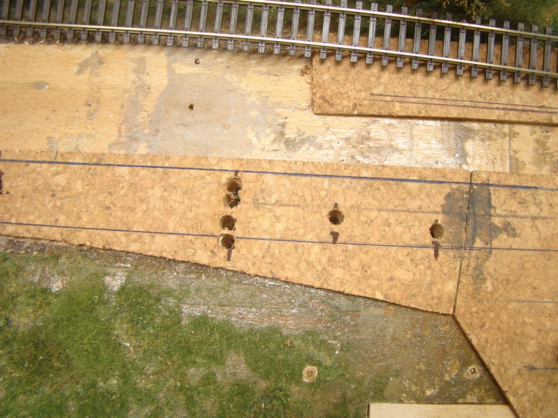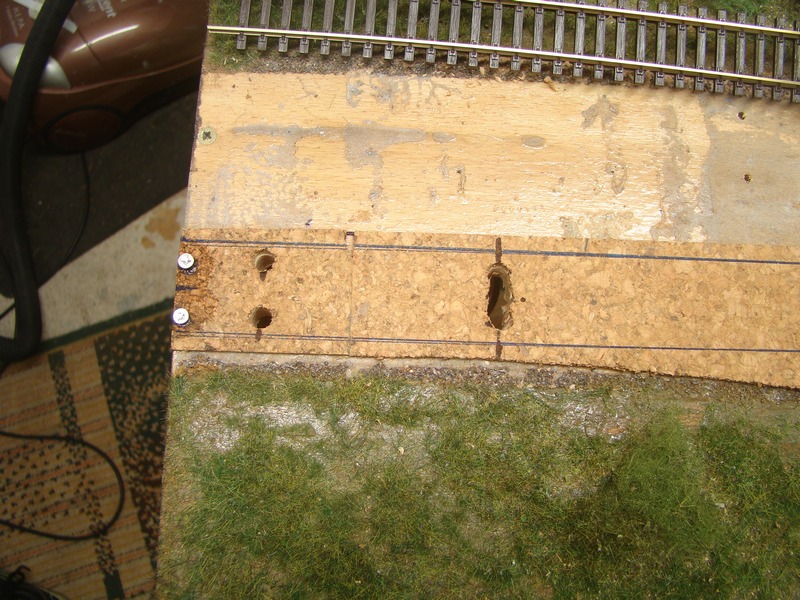 Teď už do připravených děr nasunu kolej nebo v mém případě výhybku s naletovanými vodiči.