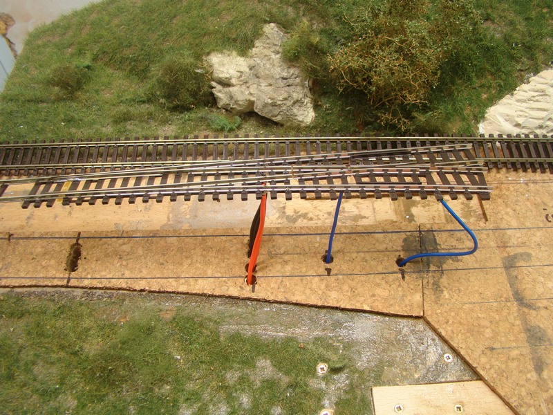 Teď to letovaní drátů. Je třeba prvně kolej a v mé ukázce i výhybku prvně na pokládku nachystat a rozmyslet si, kde chci dráty mít. Je víc než vhodné mít napájený opravdu každý kousek koleje, nespoléhat na spojky neboť pozdější oprava je daleko složitější než to zrovna udělat pořádně. Na kolej si navleču pruty a v místě kde chci mít dráty pražec buď vylomím nebo posunu spoj v podloží tak abych mel jeden vynechaný pražec. Jde to letovat i na tupo ale takhle je spoj pevnější. Nejsem počítač nýtů takže zbaběle používám vodivé i izolované spojky. Když vím co chci, tak si kolej položím do místa kde bude a zafixuju připínáčky. Zrovna na fotce to jsem je asi už vytáhl. Označím si místa kde budou dráty, a kde mě vychází táhlo pro přestavník. Značím obě osy a značím i na pruty neboť pak vím kde mám díry v podloží a kde má být drát.