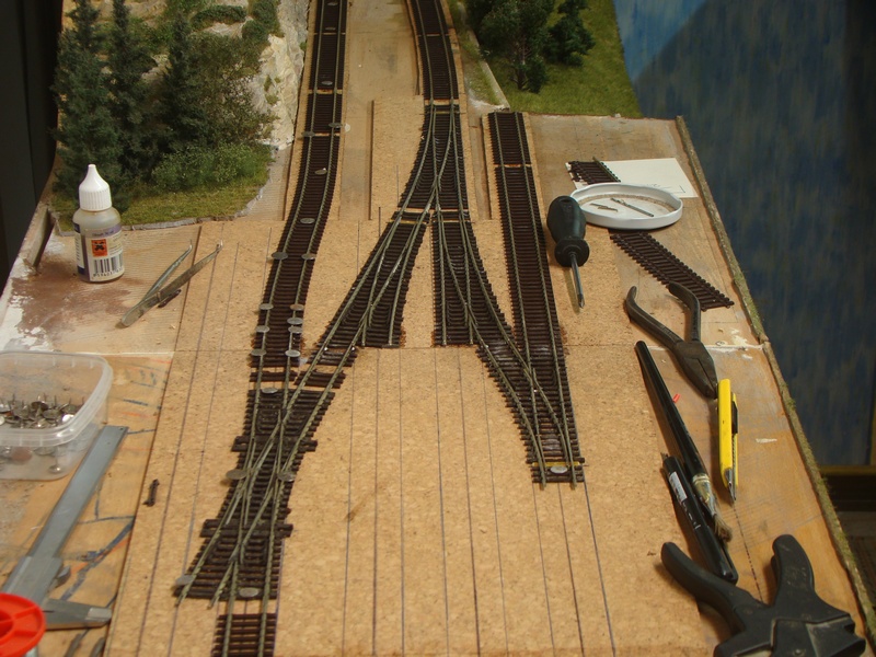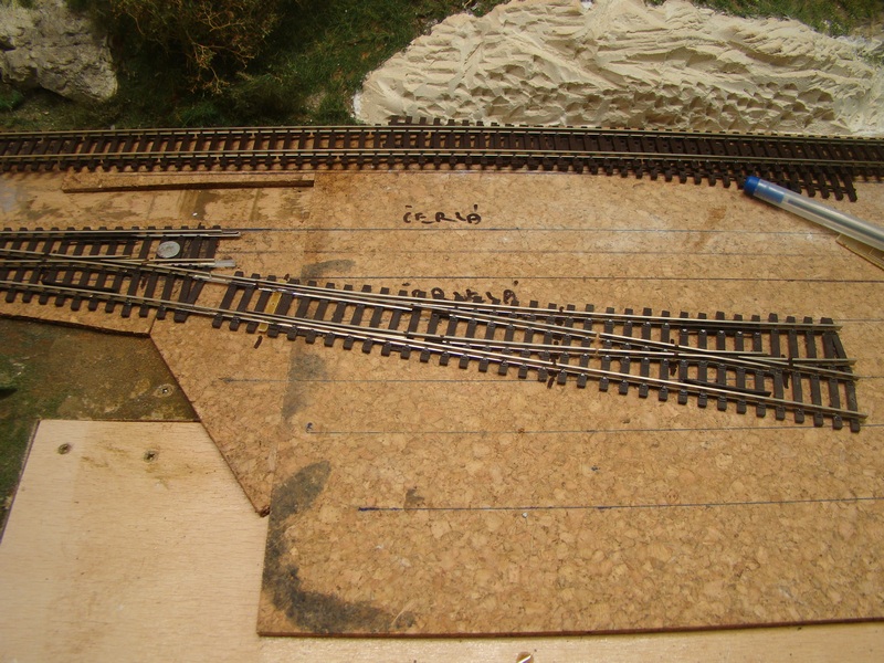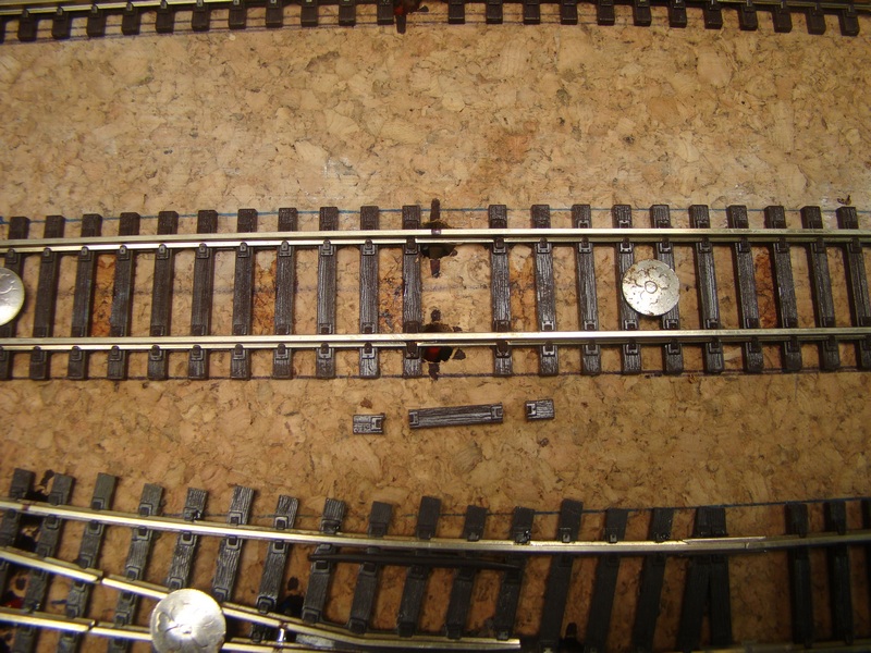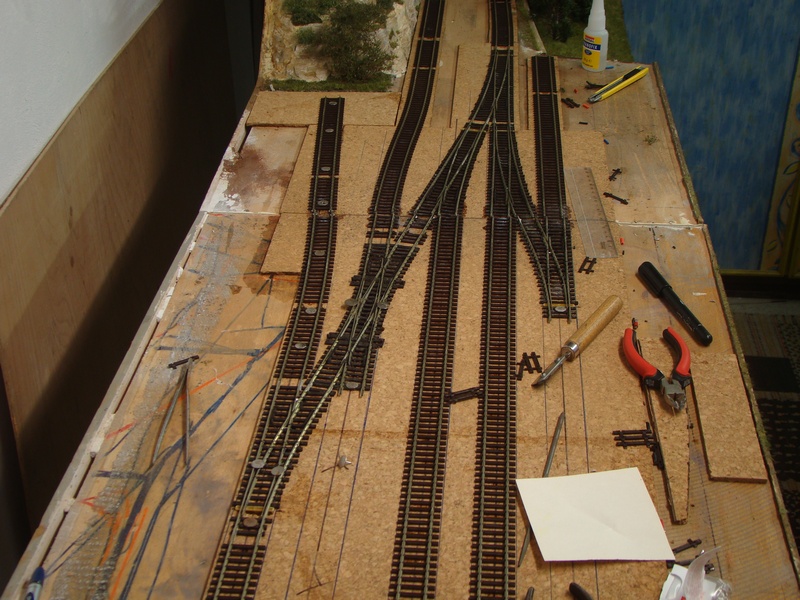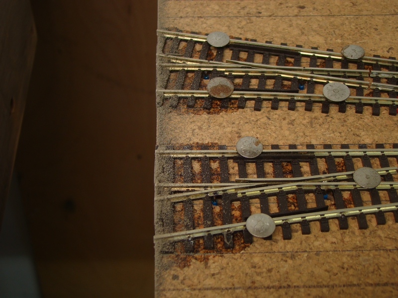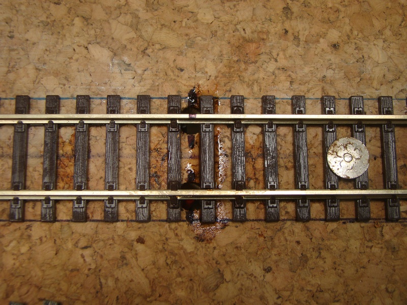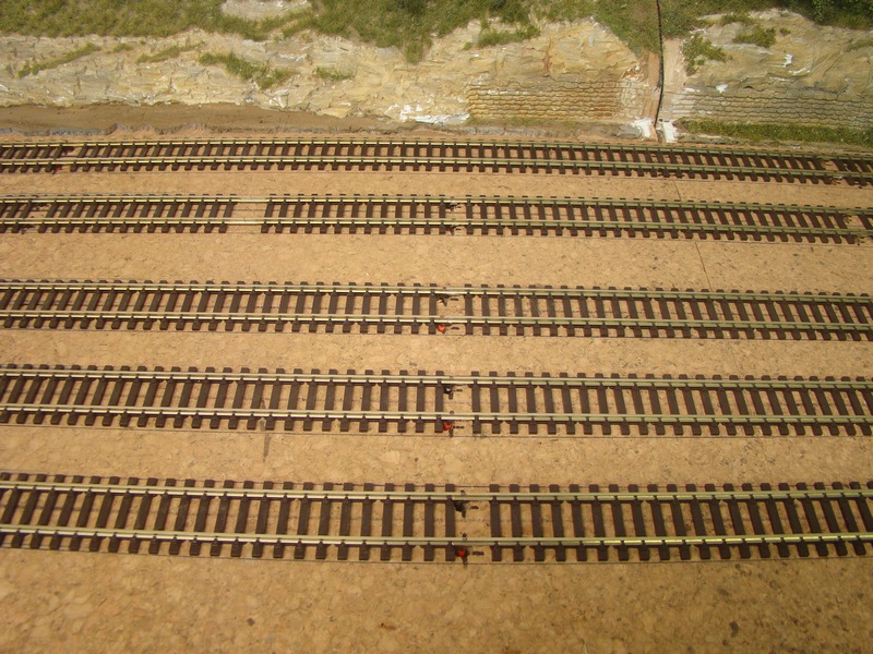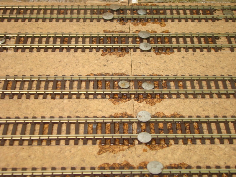 Po srovnání kolejí a výhybek následuje jejich přilepení sekundovým lepidlem ke korku. Používám řídké vteřinové lepidlo, které kapu mezi pražce. Kapu kde mě to pasuje cca každý 5 pražec. Stává se mě však, že po zaschnutí lepidlo lepidlo zbělá a občas navzlíná i na pražce. Prozatím jsem nedošel jak tomu zabránit, ale jde to dolů po úplném zaschnutí lihem a šudláním přes pražce tvrdým štětcem.
