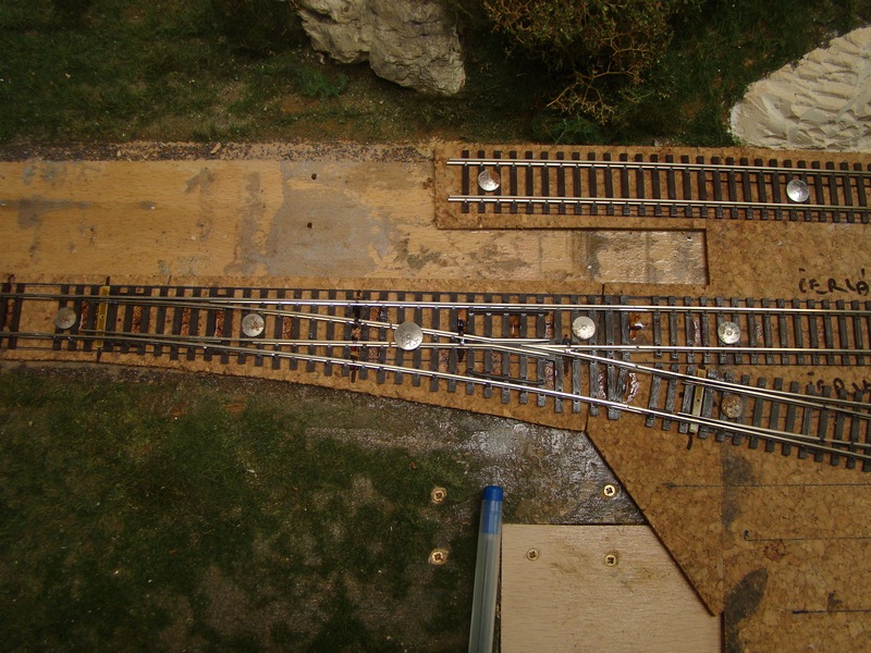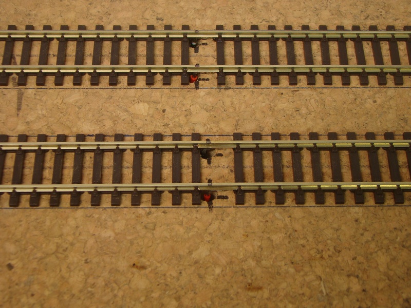 Místa připojení drátů se snažím mít přibližně v rovině ať vychází pěkně do čokolády. Kolejové pruty jsou na dalších fotkách položené s naletovanýma drátama před vyrovnáním a fixací připínačky.