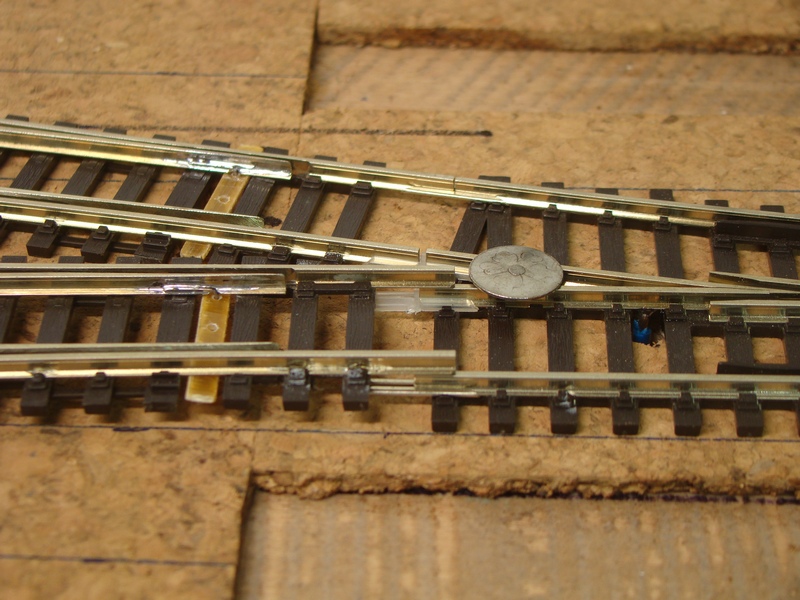 Když jsem výhybky upravil, naletoval vodiče a výhybky opět vložil na místa kde mají být tak přišlo na řadu jejich vyrovnání a přichycení připínačky. Pak lepení sekundovým lepidlem. Následně jejich zakrácení tak aby nečouhali přes modul žiletkovou pilkou a zabroušení smirkem.