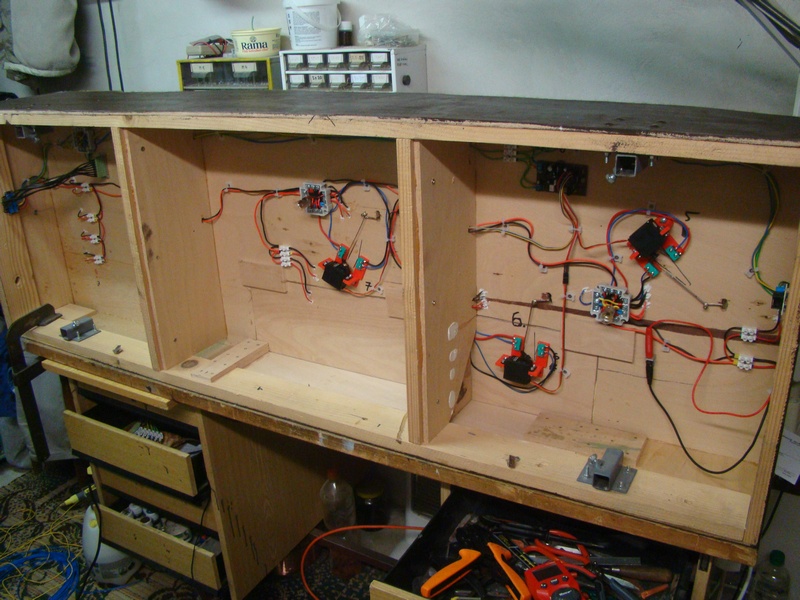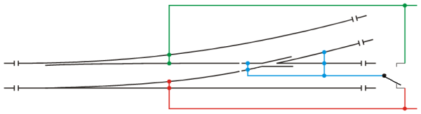 Co se týče elektroinstalace, tak používám dvojici mikrospínačů na každou výhybku. Zapojení používám tohle (zdroj zababov) kde jsou místo jednoho přepínače použity dva spínače.