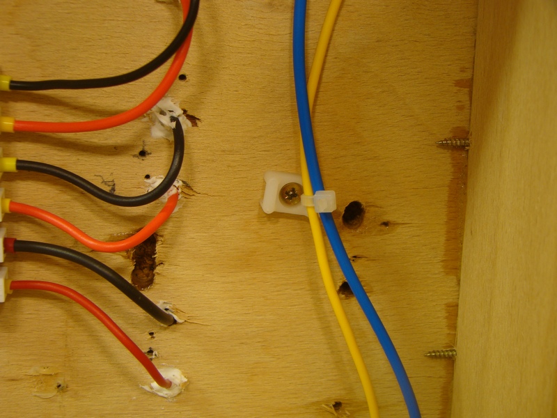 Vedení drátu fixuju do kabelových příchytek stahovacíma páskama. Na modulech jsem měl dříve i lepící příchytky které se lepili oboustrankou která byla součástí příchytky. Časem bohužel tyto příchytky přestali držet a musel jsem je stejně šroubovat takže teď už šroubuju zrovna. Na fotce je vidět i zaslepení děr které jsem vrtal pro protažení drátů od kolejí. Zalepuju silikonem nebo akrylátem v tubě. Dělám to kvůli tomu aby nepropadával štěrk.