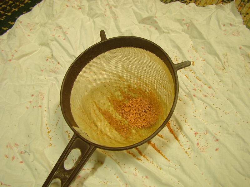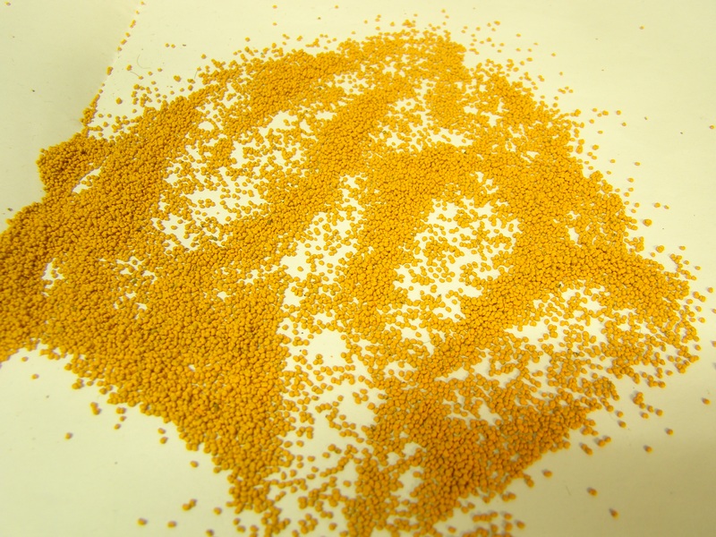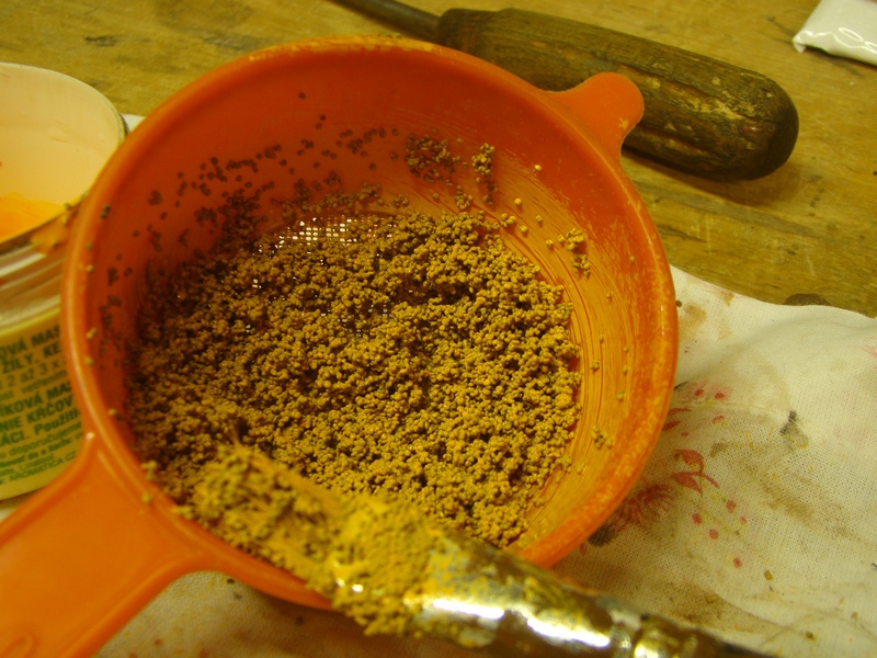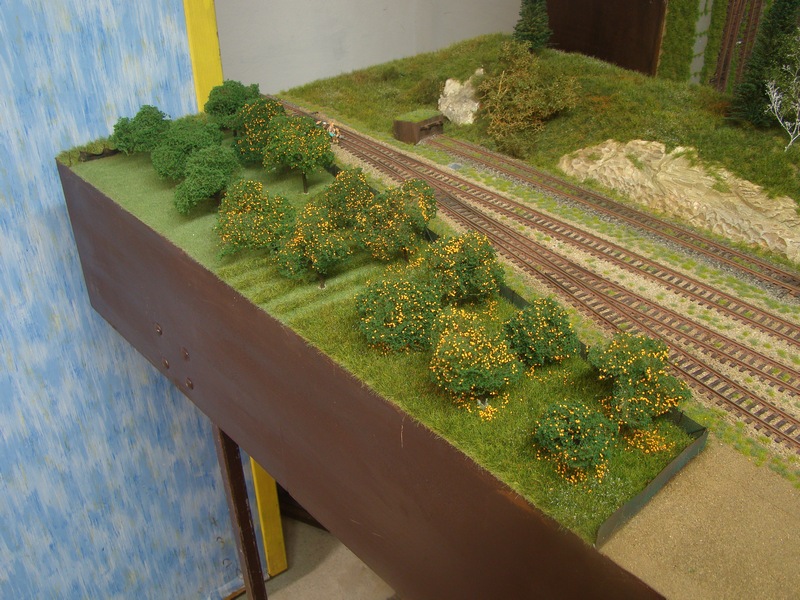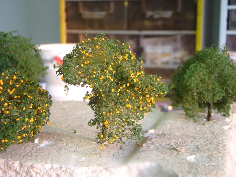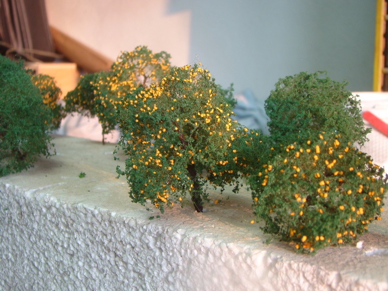 Při stavbě nádraží lom jsem si vymyslel že volnou plochu která mě zůstala na jednom zhlaví využiju jako sádek meruněk. Vyrobit stromky nebyl až takový problém a ale jak udělat ty meruňky. Meruňka má řekněme 5-7 cm a v měřítku je to nějakých 0,6 - 0,7 mm. Při přemýšlení a ptaní se kolegů nakonec vyhrála varianta obarvit něco na oranžovo. Chtěl jsem koupit nějaké semena ale nakonec zvítězil mák. Ten jsem natíral v čajovém sítku oranžovou akrylovou barvou co mě zbyla z malování. Natíral jsem tvrdým štětcem šmidlením a promícháváním v sítku.