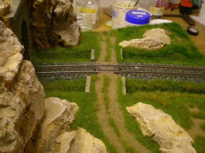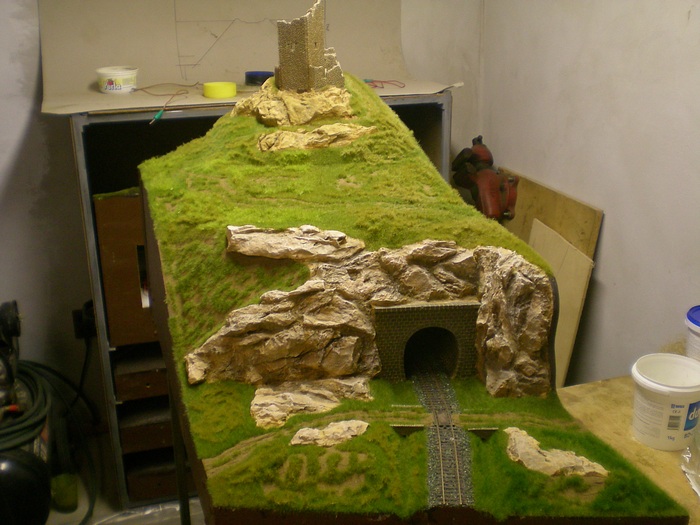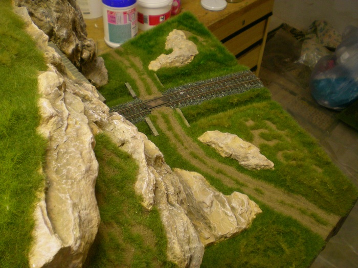 Ahoj, jak uz psal kolega Mlha, tak vystava v Luhacovicich se nam kvapem blizi, tak finisujem kde muzem. Protoze chci aby i tunel byl konecne aspon zeleny, tak doslo konecne i na nej. Povrch modulu jsem zaflokoval statickou travou. Pouzite barvy jsou ruzne co bylo doma. Delka je vetsinou 4mm, jen na polni ceste jsem skusil mensi 2mm. Mozna to nebude na fotkach videt, je to jen kousek, pri pohledu na modul je to z prave strany te horni polni cesty. Flokovani bylo provadeno na dvakrat.