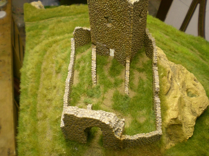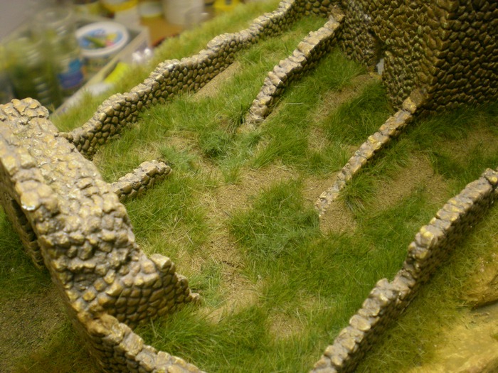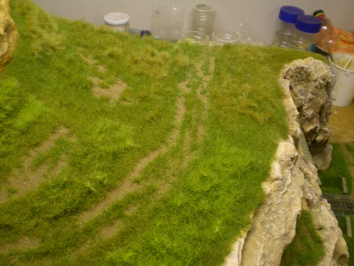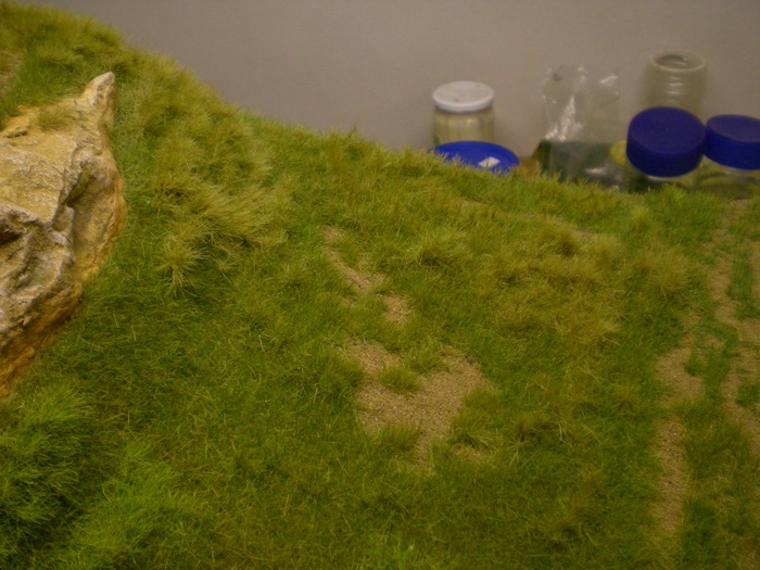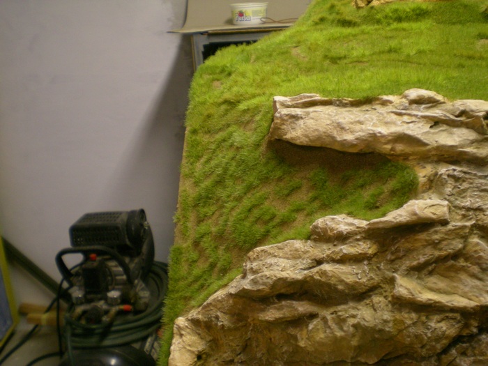 Prvne jsem komplet modul zaflokoval ve vetsich plochach pomalu se menicima barvama travy. Delam to tak, ze zaflokuju cast, (natiram neredenym duvilaxem) necham trochu zaschnout, (v mezicase delam jinde) a pak vyfoukam vzduchem (jemny tlak, skousim tak ze si foukam na usta a musi to byt trochu citit) a vysaji vysavacem prebytky travy. Do toho prebytku pridam nejaky jiny odstin tak, abych postupne menim barvu tam kam chci.