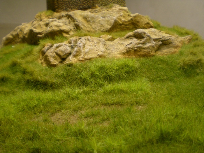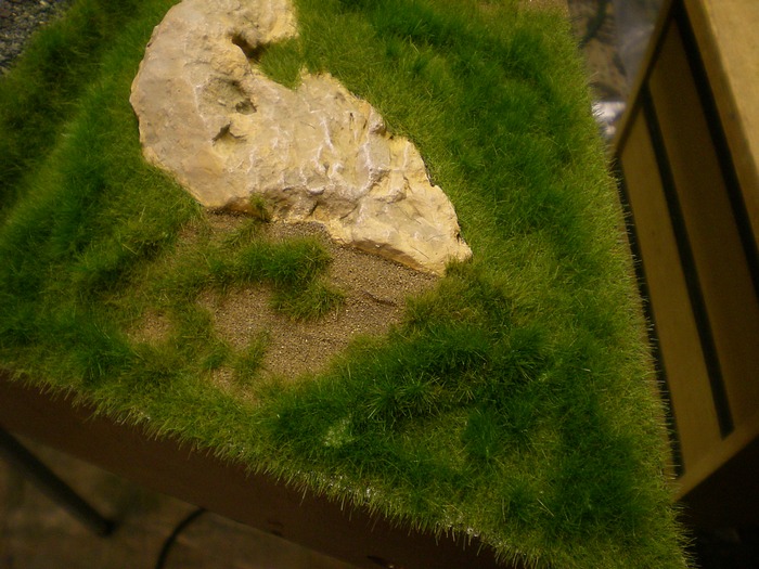 Po kompletnim zaflokovani a zaschnuti vyfoukam uz vetsim tlakem (chce to skusit aby to proste travu vycesavalo ale neskubalo ci nedeformovalo) a vysaji zbytky. Pak nastava rekneme "drnovani" a to tak, ze jezdim stetcem opet s hustym lepidlem uz po naflokovane trave, ruzne tecky delam nebo carky nebo to proste nejak posmydlim a nasledovne opet flokuji, ale uz jinym odstinem nez je podklad, aby ty drny byli lepe videt. To je snad k postupu vse. Ted uz par fotek. Barvy jsou mozna trochu skreslene, drny nemusi byt tak ocividne jak ve skutecnosti. Mejte se Cipisek.