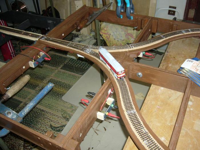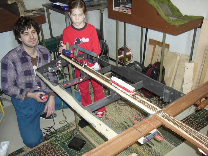 A to uz jsou testovani jizdy. Aby to nebylo jednoduche, tak jsem zjistil ze vsechny masiny jedou korektne jen herkules (ktery neni na fotce) proste blbne. Smycka si delala co chtela, prehazovala se kdykoliv i v pulce smycky. Vyjet ze smycky byl neprekonatelny problem. Opetovnym badanim jsem dosel na to ze je to spusobeno dekoderem. Je tam dekoder ROCO ze start setu z ktereho je i ten herkules. Pri prehozeni dekoderu do jine masiny blbla zase ta s tim roco dekoderem. Takze dojde asi na jeho vymenu za Lenze, se kterym to jezdi normalne.
