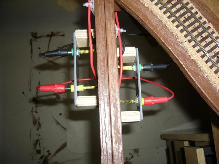 Zacnu ze vstupniho dilu smycky. Nevim jestli se jedna o standartni rozhrani, ale k spojeni modulu pouzivame zjednodusene rozhrani X1 ze zababova. Pouzivame jen zdirky J a K. Zbytek jsme vynechali a to i na dalsich modulech sire trati. Doufam ze nam to nekde nebude chybet. Co se tyce orientace S/J, tak smycka nema ani S ani J, takze bananky J a K jsou proste jak vysli. Pri zapojovani pak bananky souhlasi k kolejovymi pruty. Takze se proste jen propoji bananky, ktere budou u sebe.