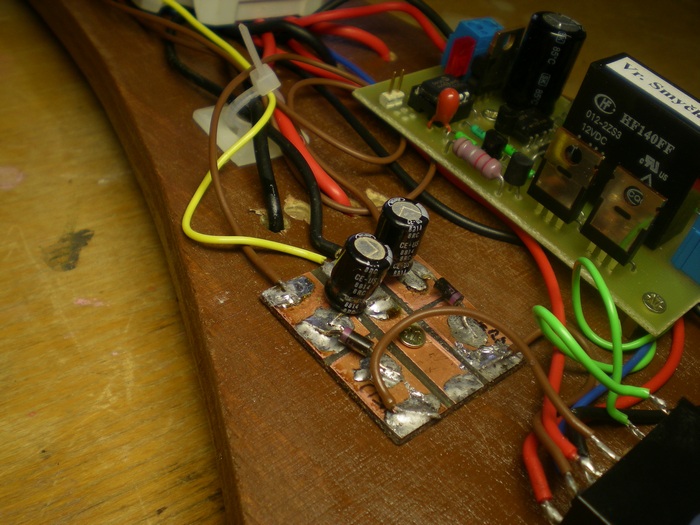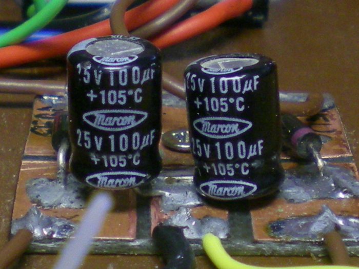 Protoze prestavnik conrade je delany na stejnosmerne napeti a je napajen stridavym (z koleji), tak museli pribyt diody, ktere usmerni napeti. Pri pripojeni, ale prestavnik vrnel, jak kdyby mel malo elektriny. Po porade s pritelem na telefone me bylo poradeno pridat do obvodu elektrolyticke kondenzatory. Jsou zapojene jednim polem na spolecny pol prestavniku (jeden z dratu J a K) a druhym polem na jiz usmernene napeti po diodach. Pozor na polaritu, lepe zmerit kde je + a kde -. Nic moc se nestane kdyz se to prepoluje, trosku pufne kondenzator a muzete ho vyhodit.