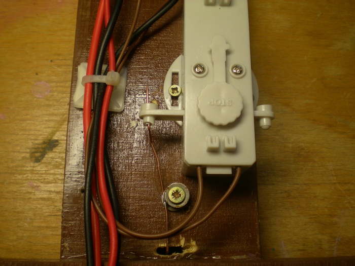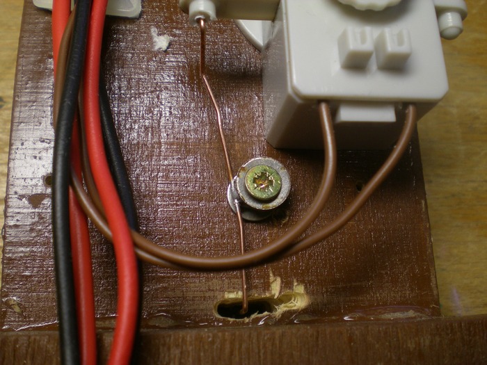 Pro prenos sily z prestaniku na vyhybku jsem pouzil drat z CO2 svarecky prumer 0,8. Ten je naletovany na maticku M4 a ta je pak pres dve podlozky (aby se nevaklala) stahla k preklizce. Dela vlastne kloub aby byla patricna draha na vyhybce.
