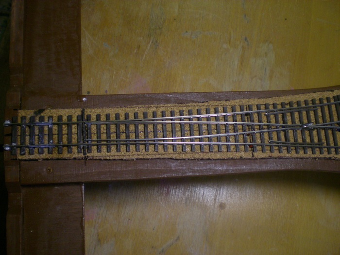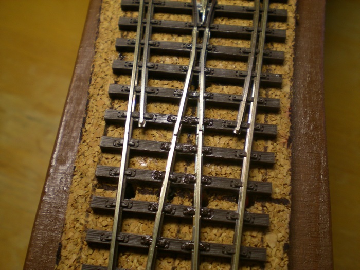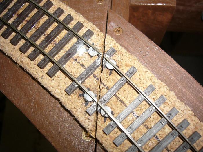 V zadu to same. Pri spilovavani precuhujicich koleji jsem zabral vic nez bylo treba a mam tam tak 2mm mezeru. Pri testovacich jizdach to nevadilo, tak snad to nebude vadit ani pri provozu. Vsechny koleje jsou k korku lepeny ridkym sekundovym lepidlem rekneme kazdy 5ty prazec cca. Kdyz jsem je pokladal tak jsem je fixoval pripinacky a pak zatizil.