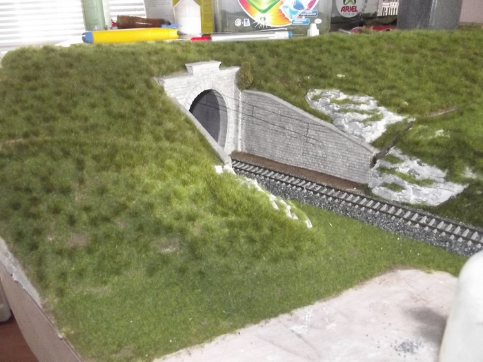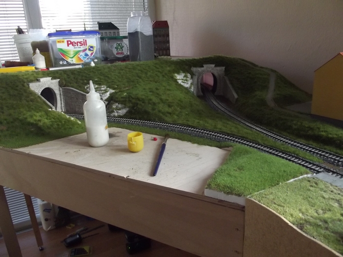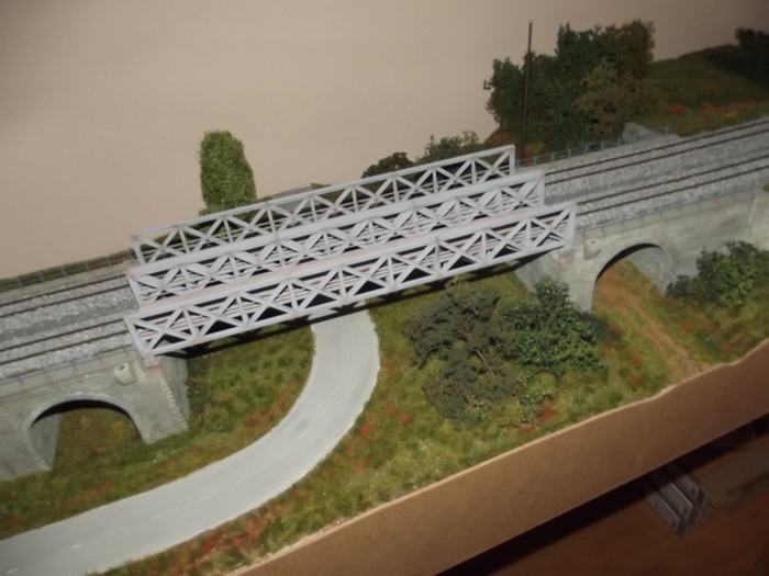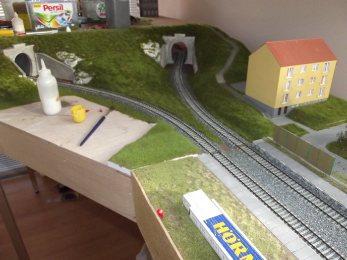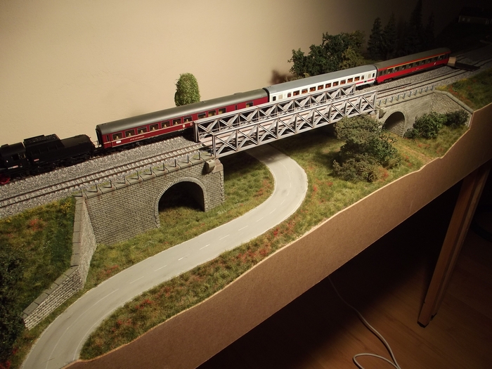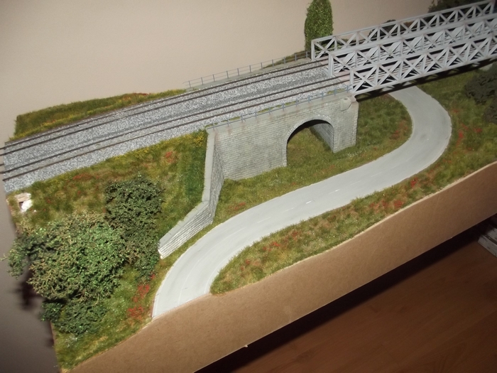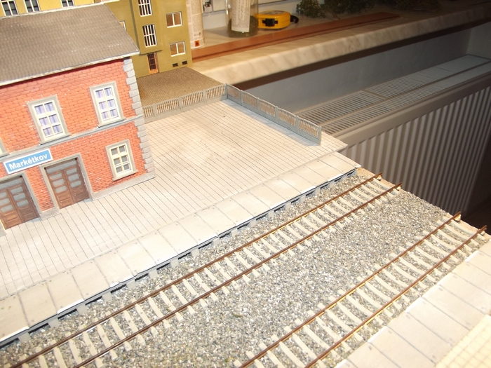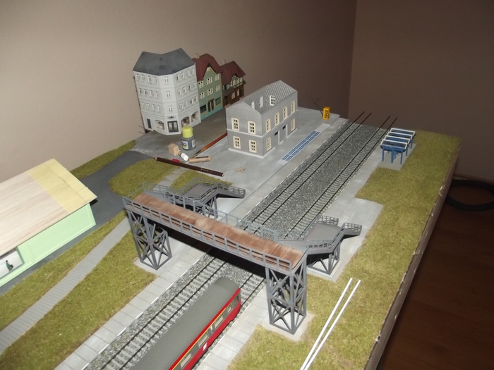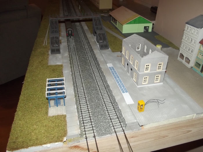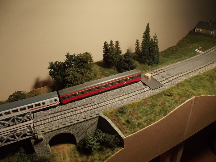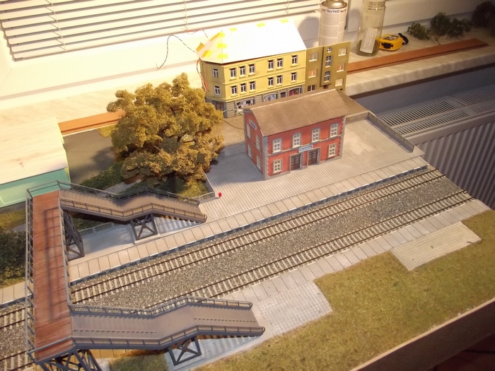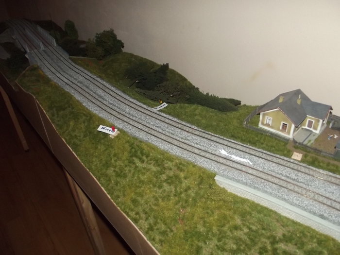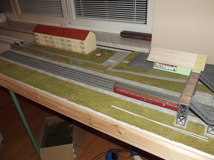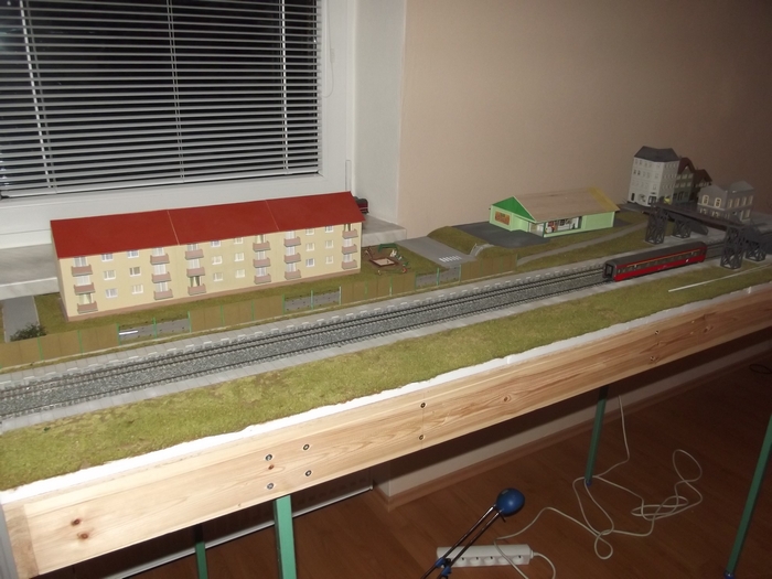 včera jsem byl na návštěvě u kolegy Broňka.Přišel jsem pofotit jeho pokrok ve stavbě dvoukolejných modulů.Dodělal už mosty a dvoukolejku s výškovým rozdíle,čeká se už jenom na lepty bran.Je to vidět na fotkách,kde jsou místo bran špendlíky.Další část dvoukolejky je zastávka s nadchodem,tady se Broňek vyřádil.dostal mě s obchodem,pěkná stavba je i rozestavěná budova nádraží.Podotýkám,že okna jsou kastlové.