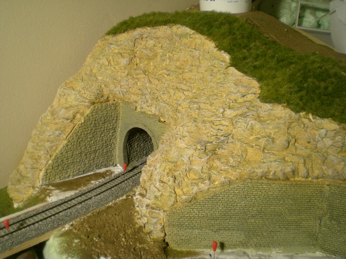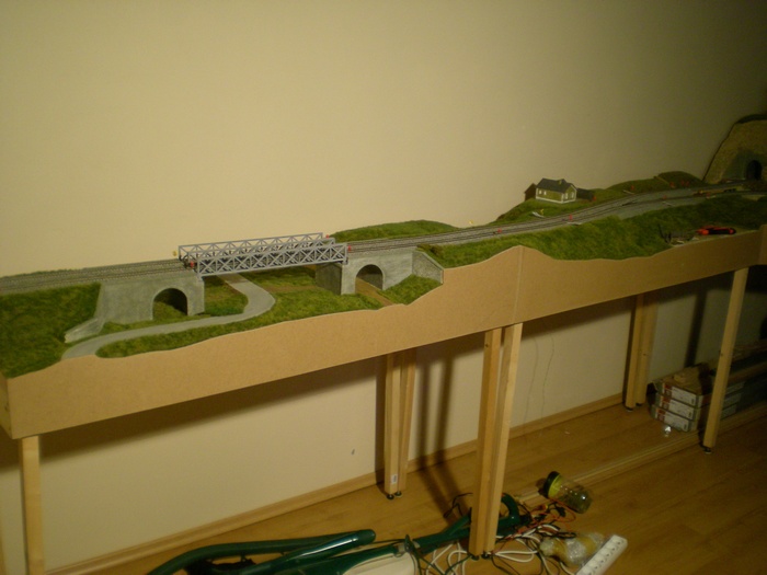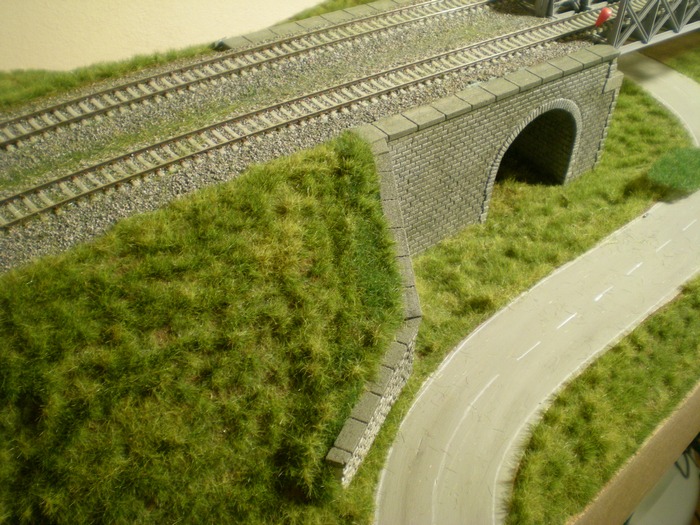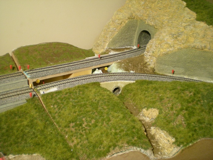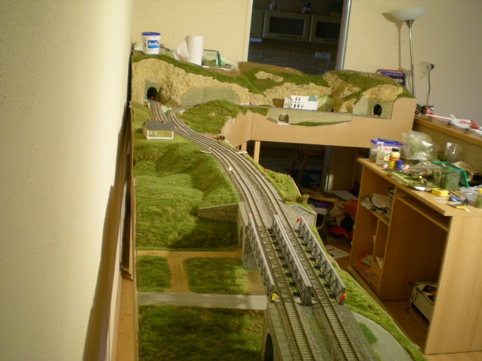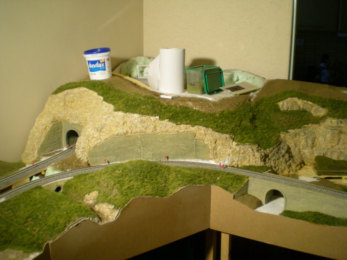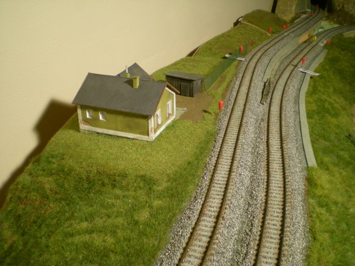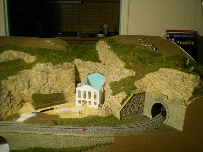 Ahoj kolegove. Byl jsem dnes na pokecu u kolegy Bronislava a vyfotil jsem jeho novy vytvor pracovne jsem to nazval "smycka na dvoukolejce". Jedna se o koncovou cast dvoukolejne trati, ktera je zakoncena smyckou v tunelu. Nad tunelem se bude tycit horsky hotel a ve skalach bude zdevastovany stary lom. Trat bude elektrifikovana, jak je v podstate cela dvoukolejka (nebo spis bude). Fotky jsou to vice mene pracovni, takze nic neni dodelano. Trochu se me tam pomotala pinzeta, kterou jme zapomeli z trati oddelat. Jeste k staticke trave. Vetsina je od Heki, nekde mistem pomichany Polak.