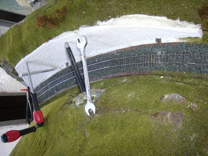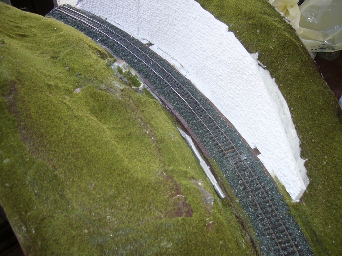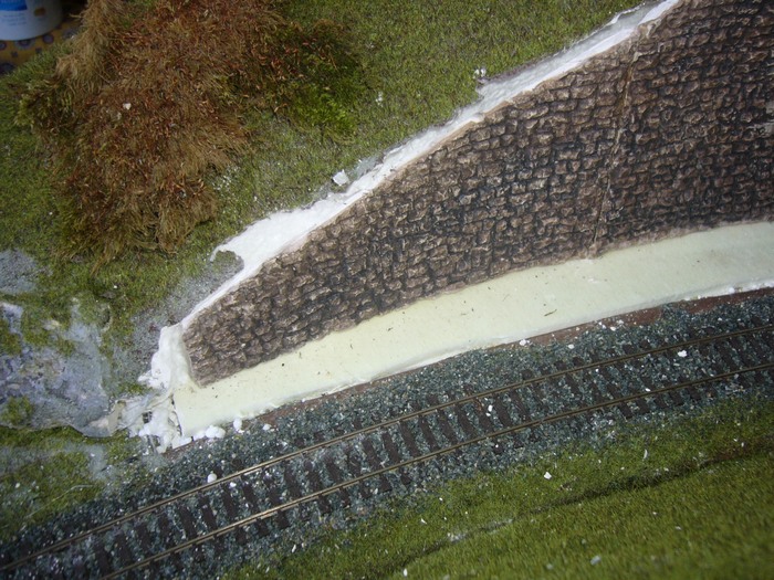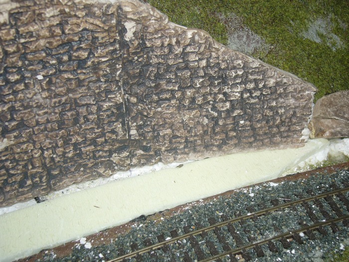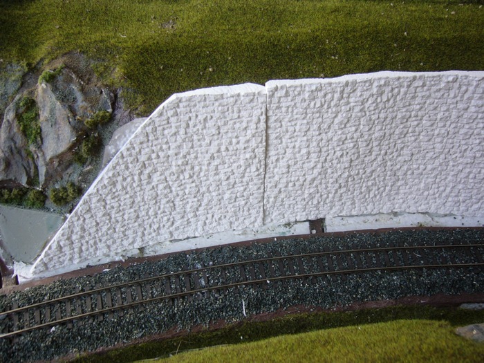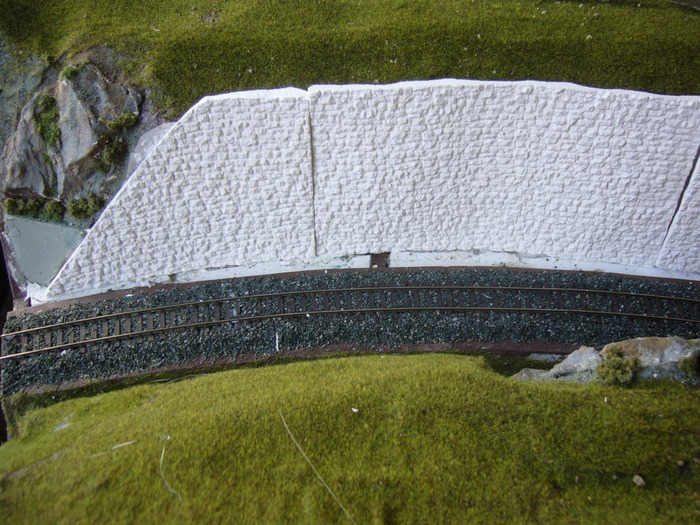 přestala se mě líbit opěrná zeď ze styroduru a tak jsem si půjčil silikonovou formu a začal olévat zdivo ze sádry.Našel jsem přibližný rádius a vytvořil první odlitky.Sádra je tuhá skoro hned,navíc,když ji uděláte řídkou tak je odlitek celkem lehký.Má to zase jedno mínus,při opracovávání se víc láme,je křehčí.Odlitky jsem poskládal k sobě a podle nich rozšířil zářez.Technologie je poněkud jiná,měl bych sádru k sobě lepit,ale přiznám se ,nedařilo se.Tak jsem oblouky naskládal k sobě,srovnal a zastříkl pěnou,po zavadnutí jsem oblouky znovu přerovnal a zapřel.Teď už zbývá jenom přetmelit spoje a vyškrábat v nich kameny.Pak bude následovat barvení.