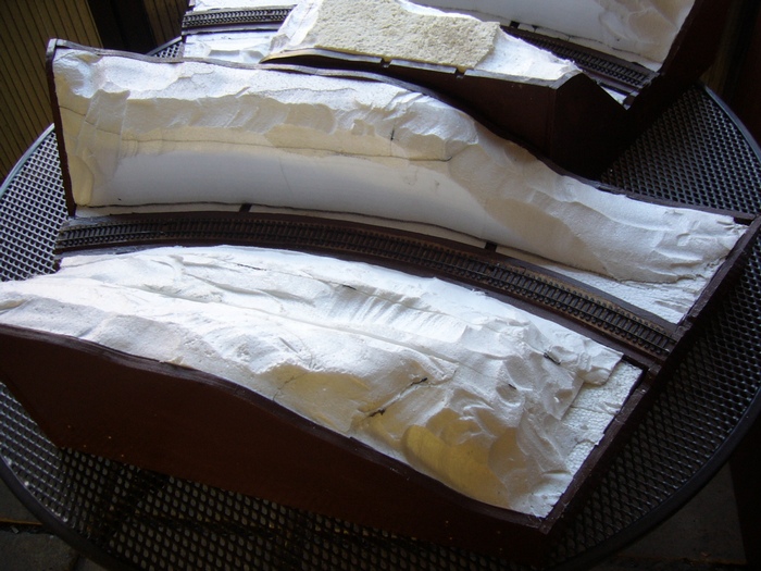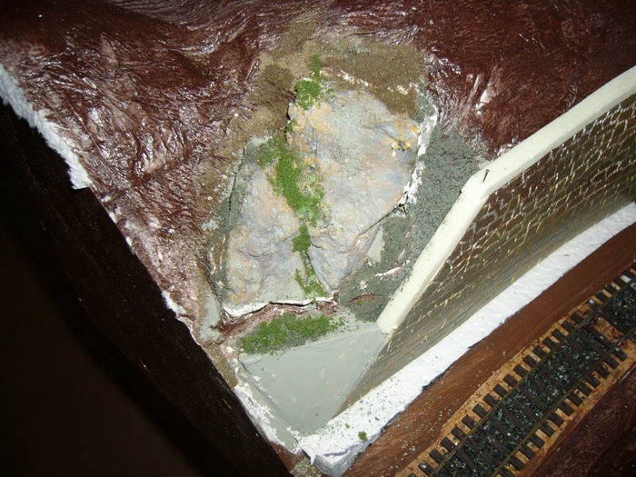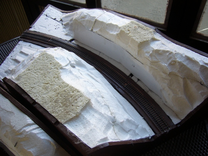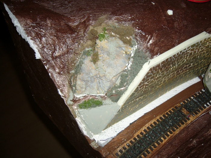 toto je druhý díl,opět na vnější straně opěrná zeď,na vnitřní skály,přes zářez půjde postavit most,zkusím udělat opěrnou zeď betonovou,na výjezdu z modulu opět nějaké skály