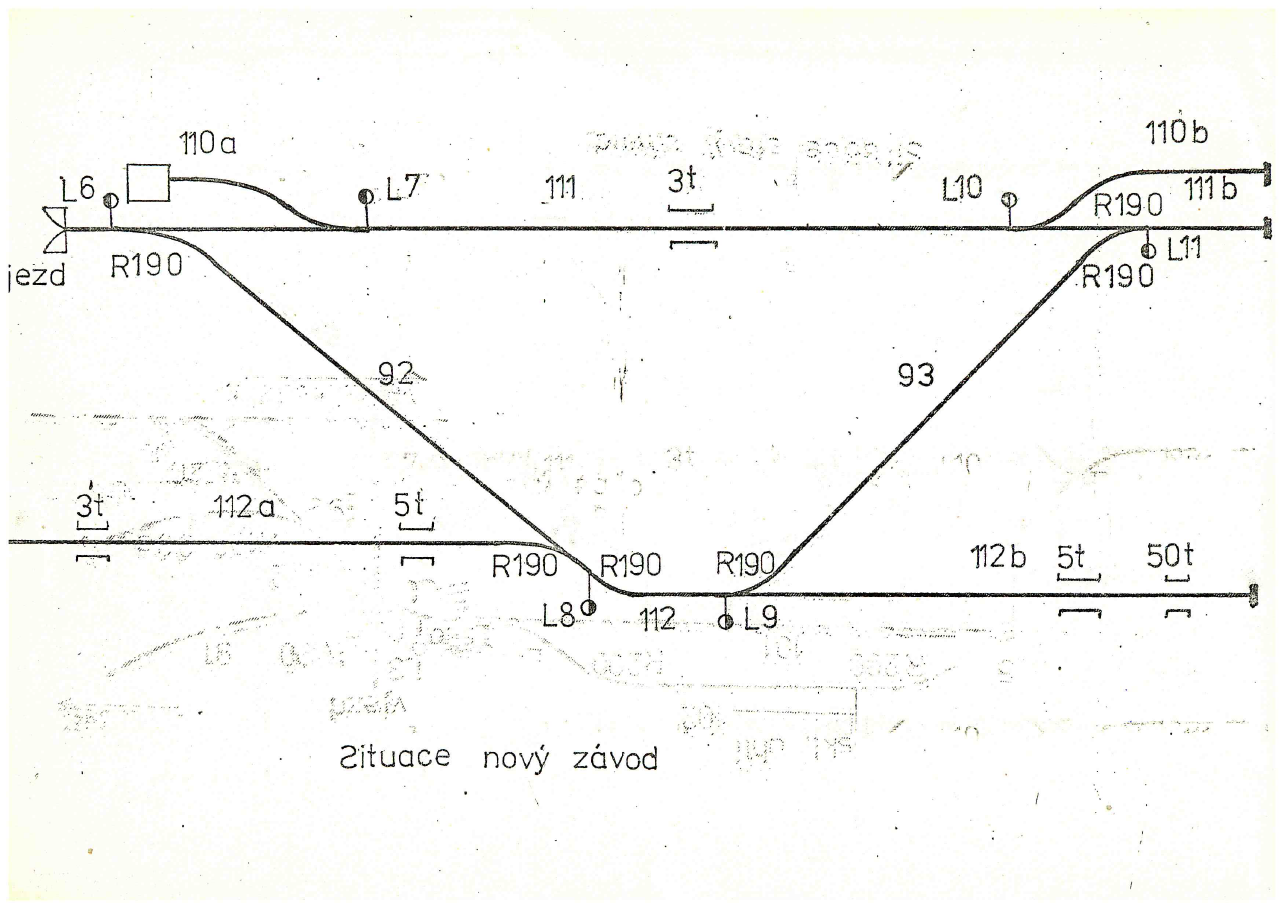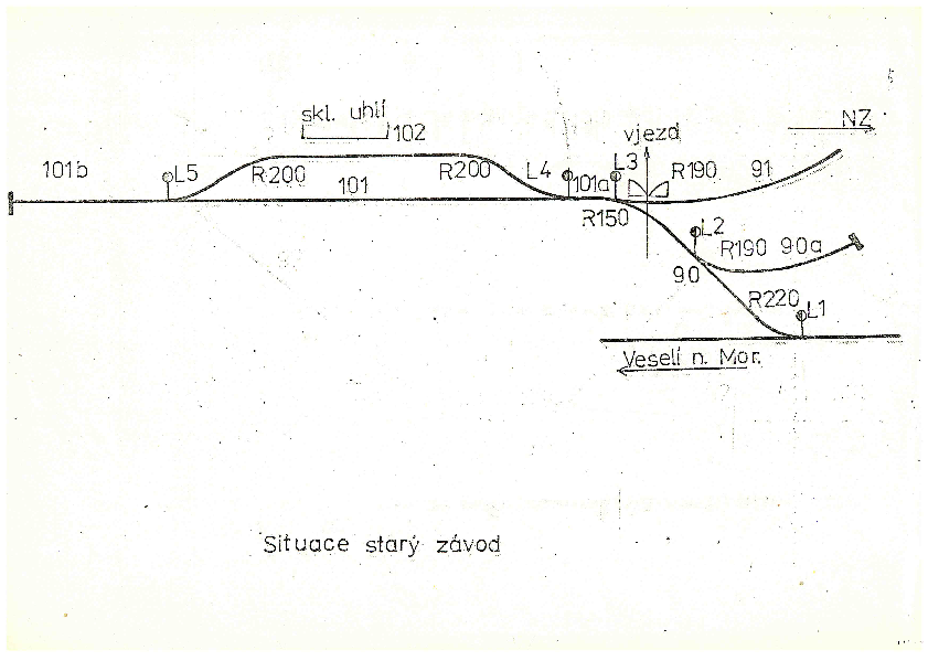 Přikládám plány kolejiště vlečky,první je situace ve starém závodě.Sem zajížděly manipulační vlaky z Kunovic,tady bylo předávací kolejiště