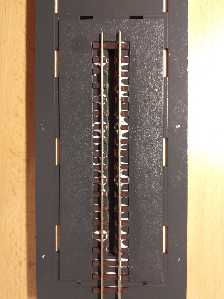Upravenou kolejnici přilepíme na základovou desku. Doporučujeme nešetřit lepidlem, aby byla zajištěna dostatečná pevnost lepeného spojení. Následně zatížit např. knihou. Disperzní lepidlo po zaschnutí zprůhlední a dá se pak při troše šikovnosti ještě napatinovat jako různé úkapy.