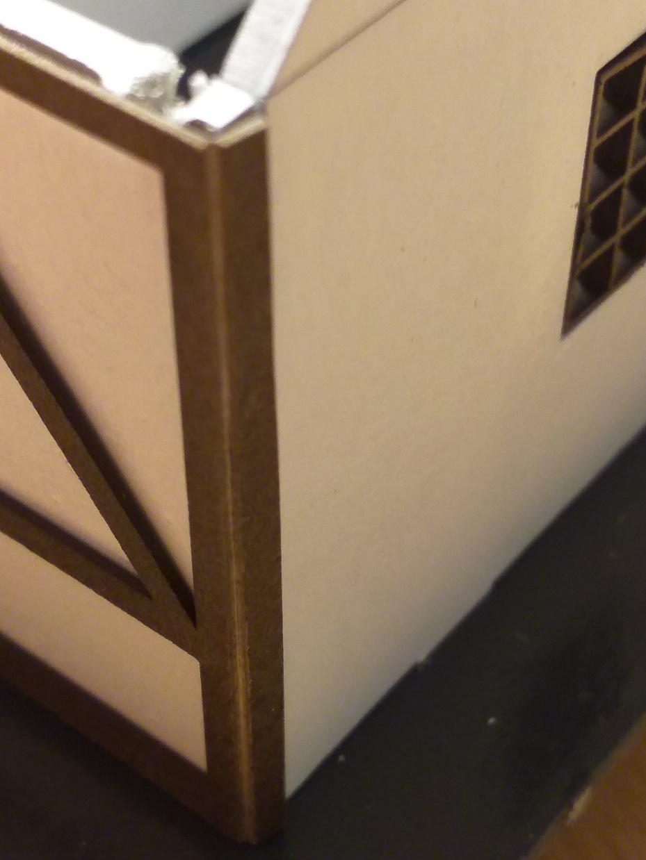 Po nalepení všech oken a dveří do přístavku přistoupíme k nalepení hrázdění budovy. S lepením začněte od podélných stěn. Velmi dobře natřete disperzním lepidlem všechny trámy, přiložte k podélné bočnici a přilepte. Každé podélné hrázdění má na svých koncích přesah 2 mm - ten přehněte do čel budovy.