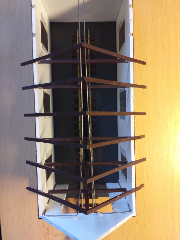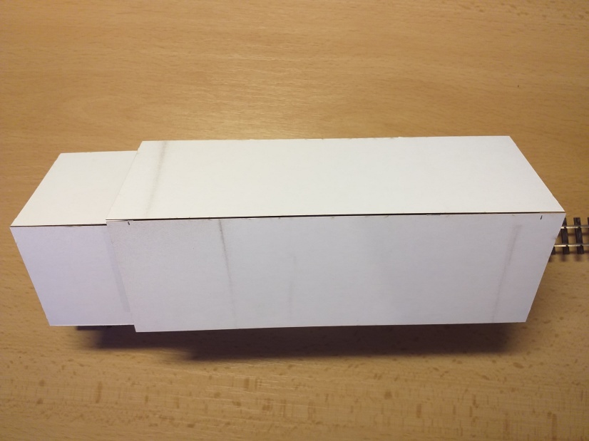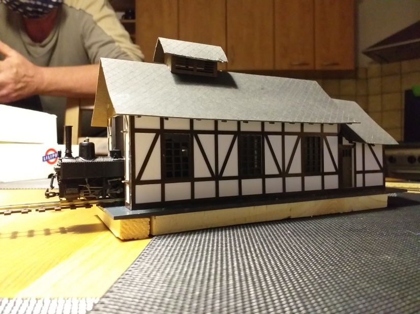 A nyní začneme na budovu výtopny lepit krovy. Po stavbě prvního kusu této výtopny došlo k dalšímu malému vylepšení. V samotných krovech jsou také předvypáleny dvě dírky o průměru 0,5 mm, kudy lze provléct ocelové struny. Díky tomu dochází k perfektní směrové fixaci ocelové struny v prostoru nad kolejí.