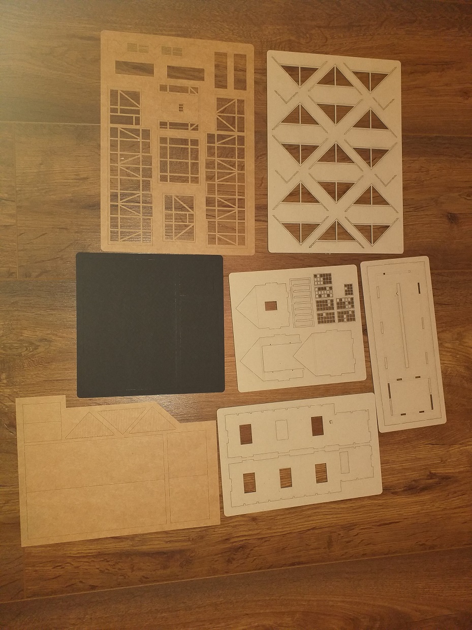 Před zahájením prací nastříkejte oboustranně podlahu, obvodové stěny a všechny krovy budovy bezbarvým matným lakem a až poté jednotlivé lakujte do finálních barev. Pro lakování jednotlivých dílů byly použity spreje DupliColor odstíny bílé (RAL 9003), tmavá šedá (RAL 7016) a hnědé (RAL 8017). K lepení použijte disperzní lepidlo Herkules (lak, barvy a lepidlo nejsou součástí dodávky stavebnice).