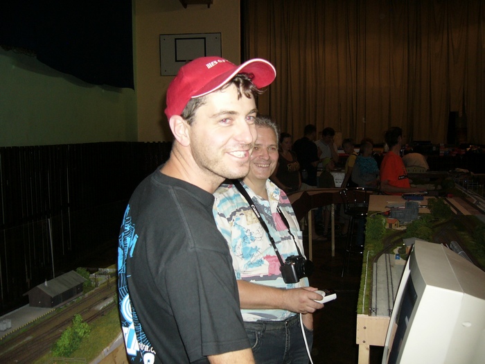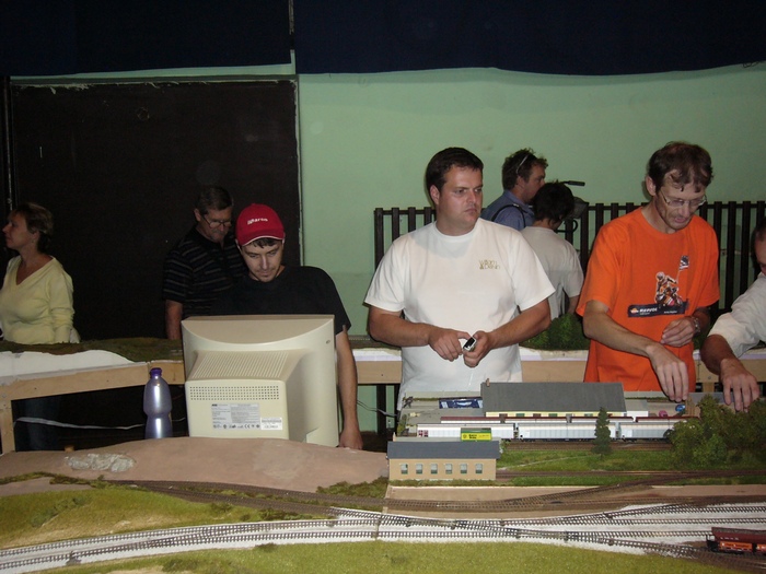 Ja a kolegove Irudzi (Jirka - v bilem) a Bronek (ten oranzovy). Ja sem dostal duveru a po pocatecnich zmatcich jsem stavel vyhybky v ustrednim nadrazi. Irudzi jezdil az se mu kourilo od ruk a Bronek se bavil v vleckovem arealu, ktery je jeho dilem.