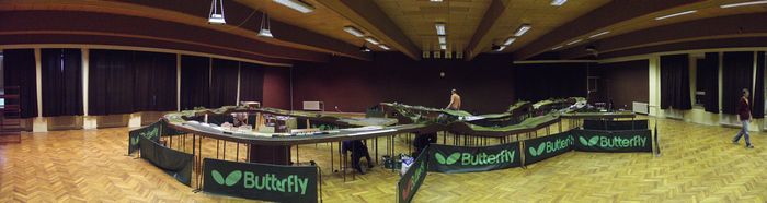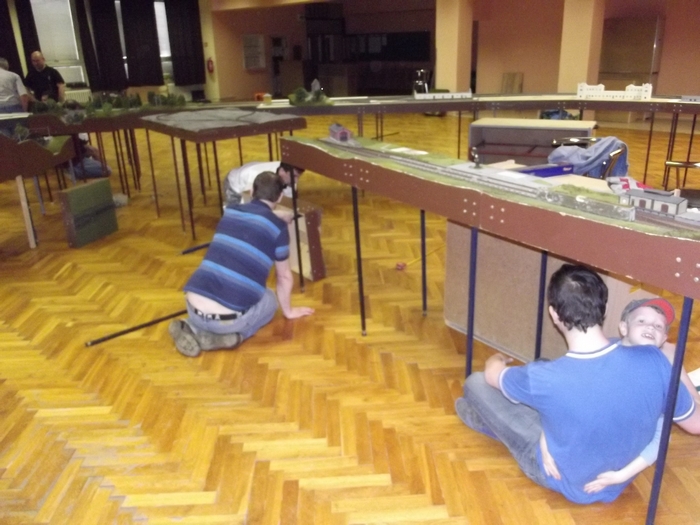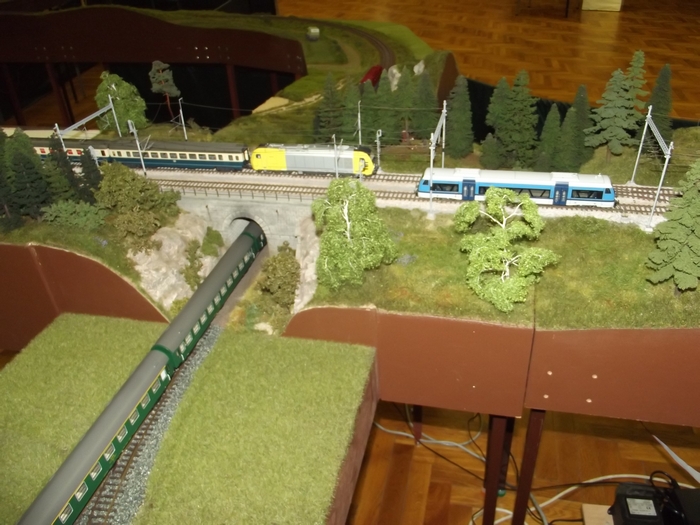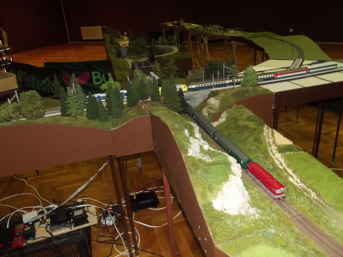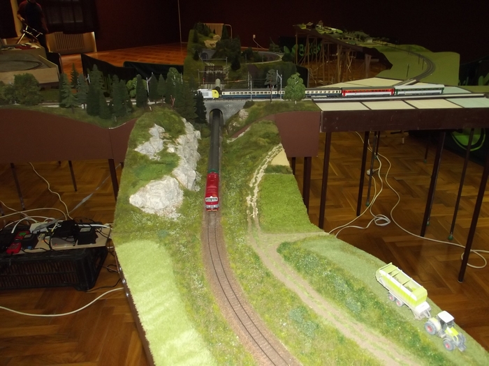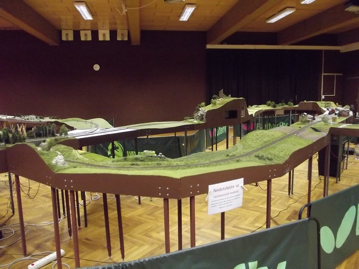 Dobrý den,ve dnech 31.5-2.6.2013 proběhla už třetí výstava modulové železnice v Hluku.Na výstavě jsme použili všechny naše moduly jednokolejky a tři z dvoukolejky Jardy Novotného.Premiéru v zeleném zažila podjížděčka,použila se už několikrát,ale ve dřevě,teď už zaflokovaná.Umožňuje nám podjíždět dvoukolejku a stavět layout ve dvou výškových úrovních.Rozdíl je 12 cm,musím říct,že toto výškové dělení kolejiště hodně provoz zpestří.