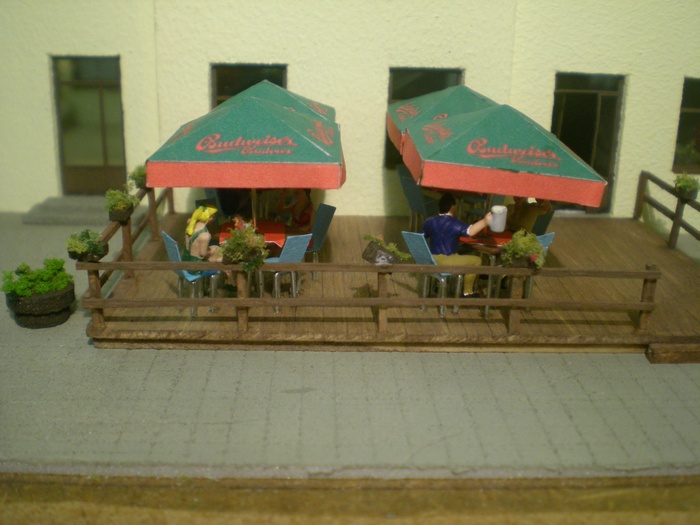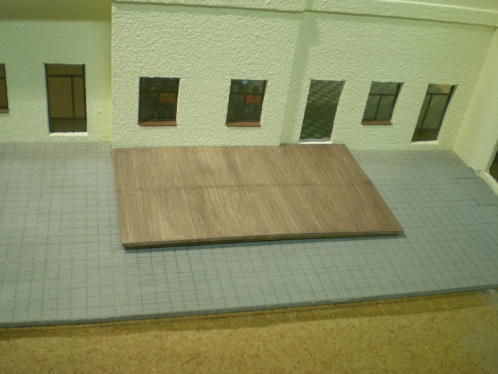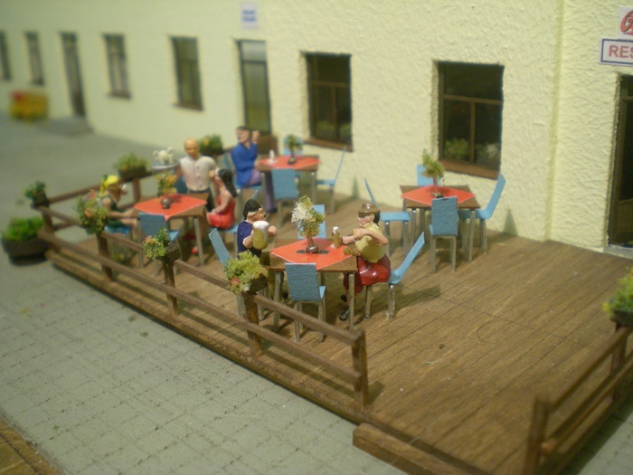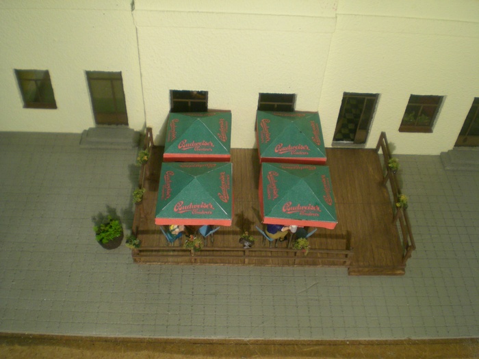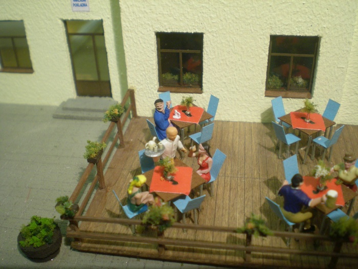 Ahoj, vanoce jsou za nami a tak jsem se opet pustil do nejake akce. Prvne jsem dodelaval venkovni prostor pred restauraci bo jsem tam naplanoval zahradni posezeni. Prace zacali stavbou drevene konstrukce na umisteni stolku a zidli. Ta je zhotovena z dyhy, narezane zalamovakem aby byli naznacene jednotlive desky. Konstrukce je ze spodu vystuzena a kvuli zvednuti podlozena drevenyma hranolkama 2*2mm. Vse je natreno redenou temperou.